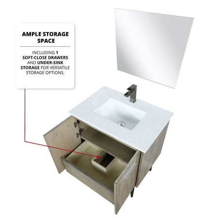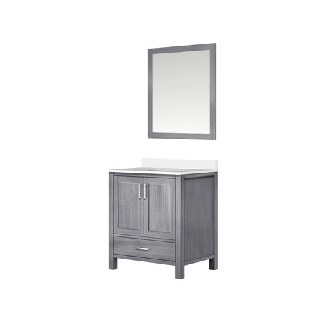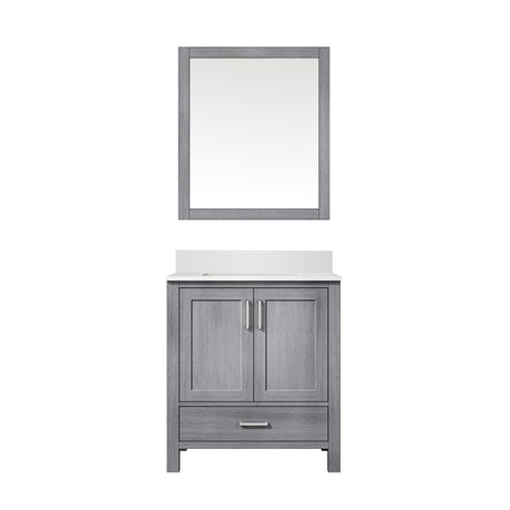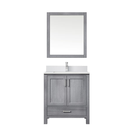 Jacques 30" Distressed Grey Single Vanity, White Quartz Top, White Square Sink and 28" Mirror