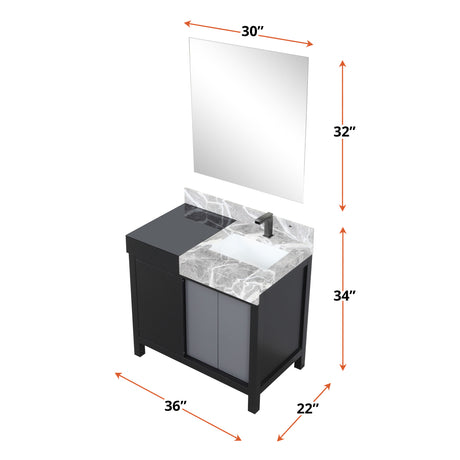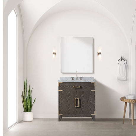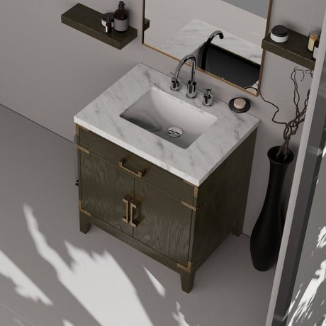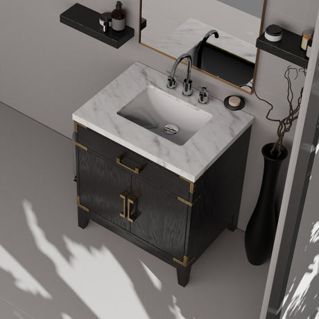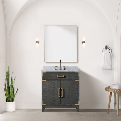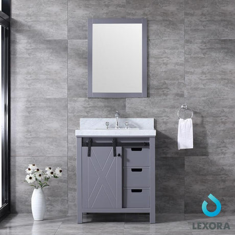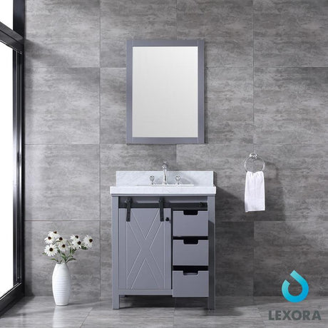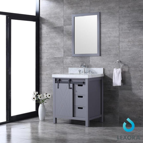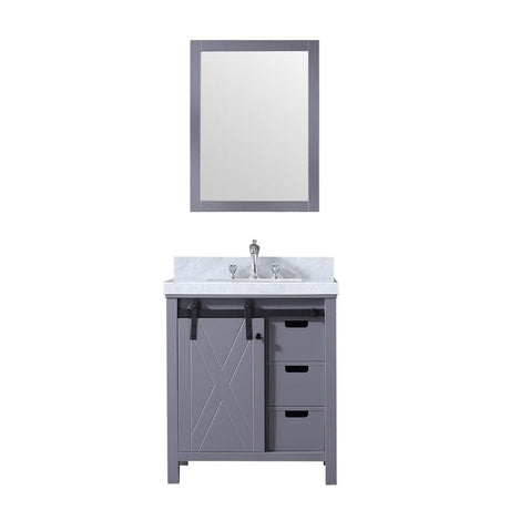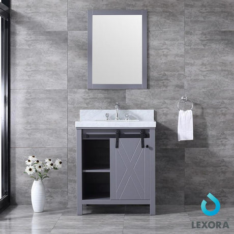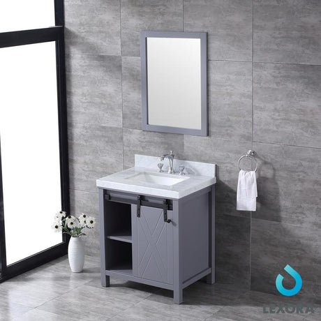 Marsyas 30" Dark Grey Single Vanity, White Carrara Marble Top, White Square Sink and 28" Mirror