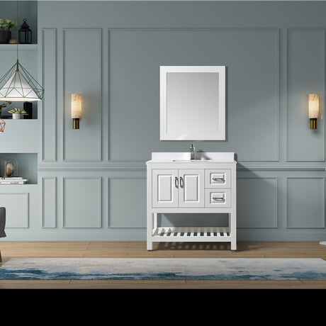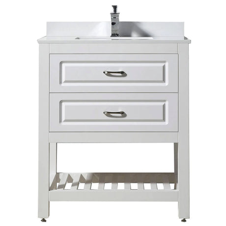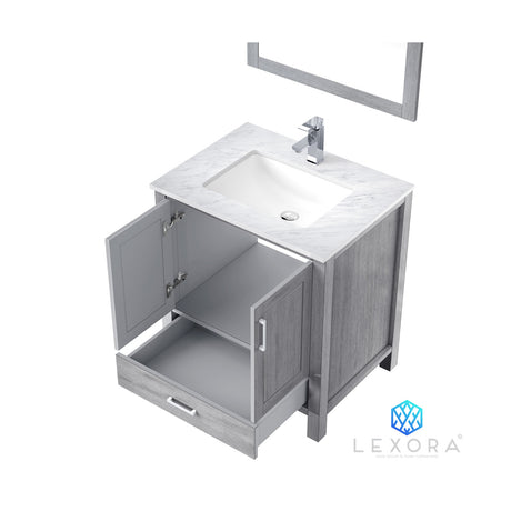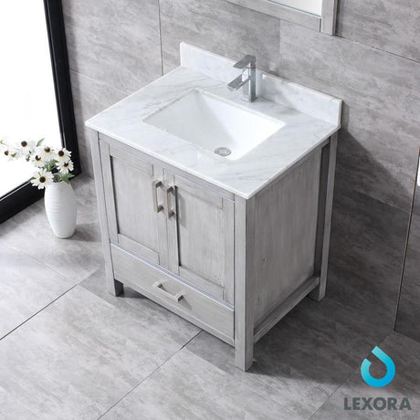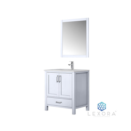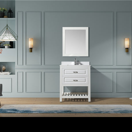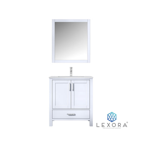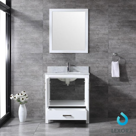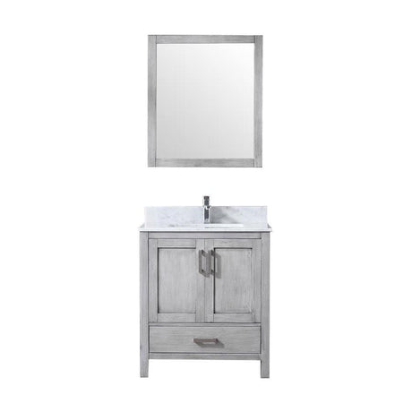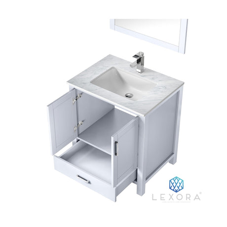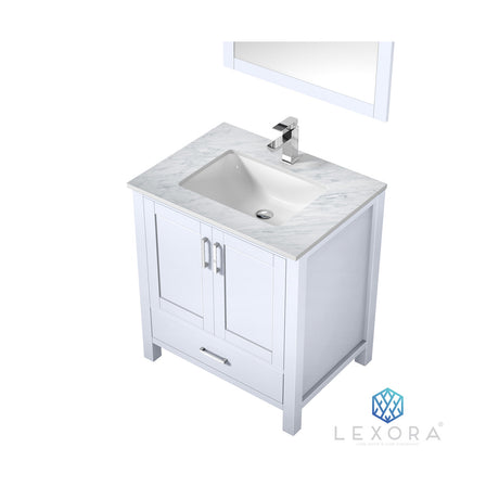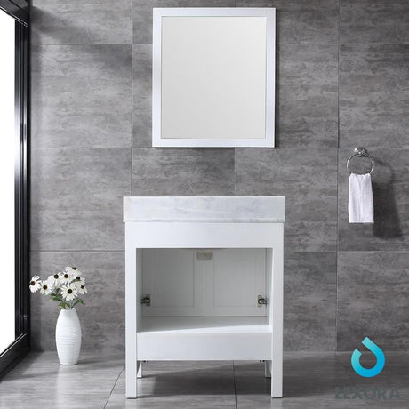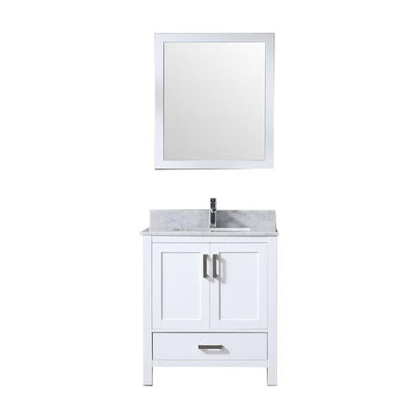Jacques 30" White Single Vanity, White Carrara Marble Top, White Square Sink and 28" Mirror