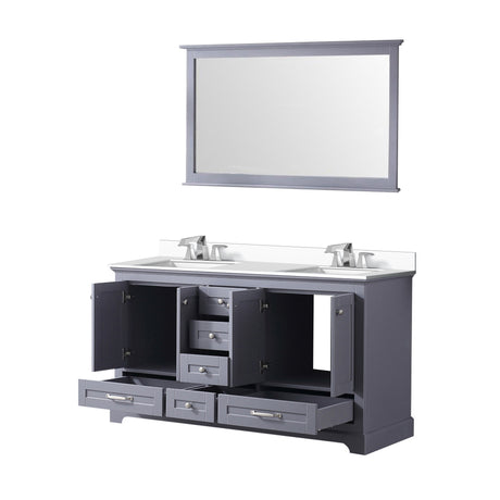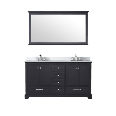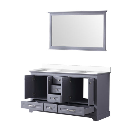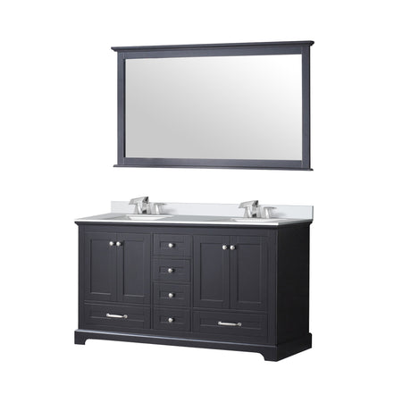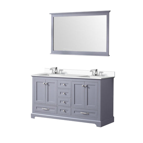Dukes 60" Dark Grey Double Vanity, White Quartz Top, White Square Sinks and 58" Mirror w/ Faucets