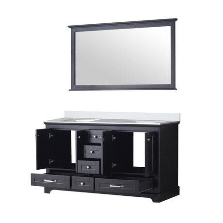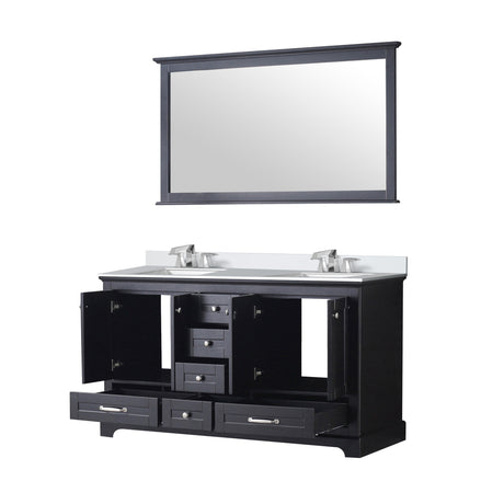 Dukes 60" Espresso Double Vanity, White Quartz Top, White Square Sinks and 58" Mirror w/ Faucets