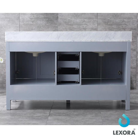 Dukes 60" Dark Grey Double Vanity, White Carrara Marble Top, White Square Sinks and 58" Mirror