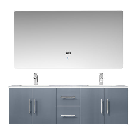 Geneva 60" Dark Grey Double Vanity, White Carrara Marble Top, White Square Sinks and 60" LED Mirror