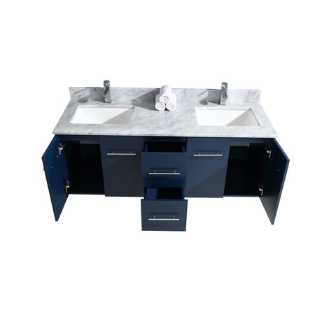 Geneva 60" Navy Blue Double Vanity, White Carrara Marble Top, White Square Sinks and 60" LED Mirror