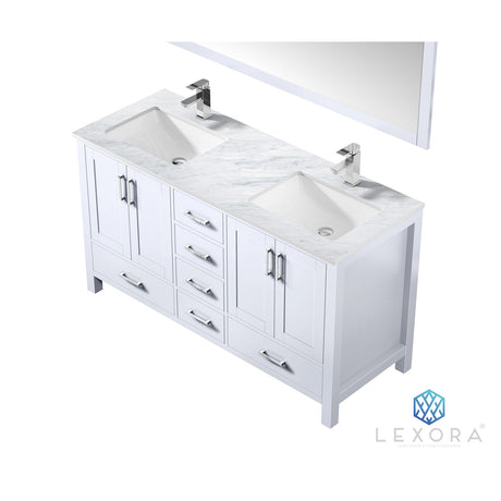 Jacques 60" White Double Vanity, White Carrara Marble Top, White Square Sinks and 58" Mirror