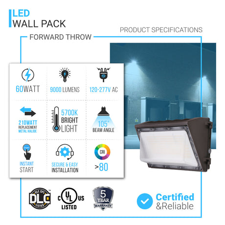 80W LED Wall Pack Light With Photocell Sensor - 10,173 Lumens, 5700K Bronze Finish - Forward Throw