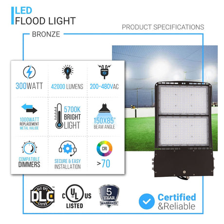 LED Flood Light 300W - DLC Listed - IP65 - Black - 40521 Lumens - 5700K - Dimmable LED Flood Lamp