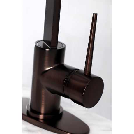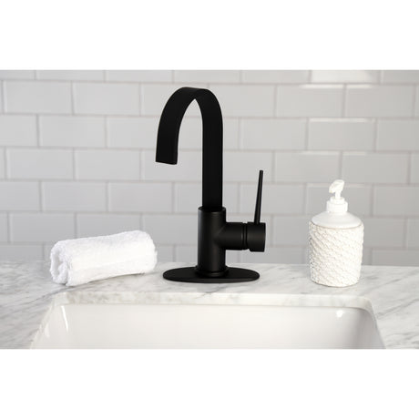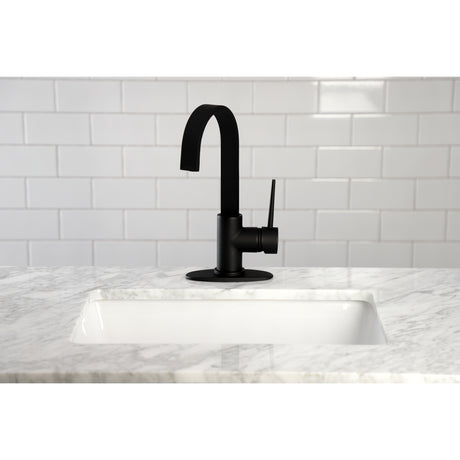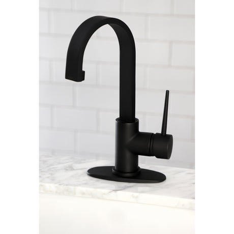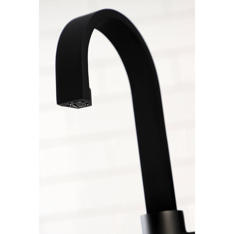 A. The faucet consists of just two parts: a control handle and an arching spout that releases water. Still, don't let the straightforward idea deceive you.