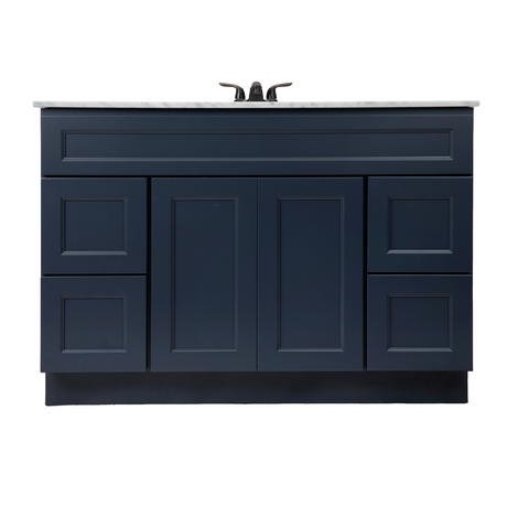 These are pre-assembled, bath vanities with tops and already attached countertops and sink basins. These tops usually consist of materials like marble, granite, quartz, or laminate. Installing a bathroom vanity with a top takes the work off your hands and helps your bathroom look uniformed. Another advantage of a bathroom vanity with a top is how easy it is to install because it usually comes 'ready to plumb' and can be used right away once installed.