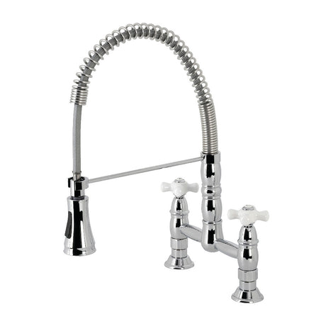 Restoration Bridge Kitchen Faucet With Brass Sprayer, Polished Chrome