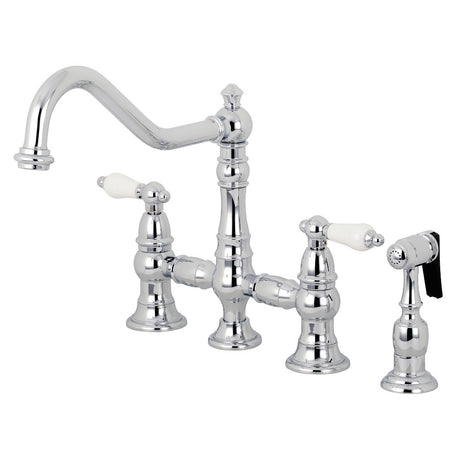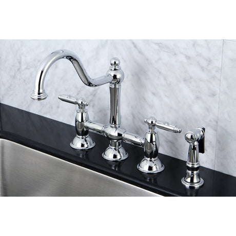 Restoration Bridge Kitchen Faucet With Brass Sprayer, Polished Chrome