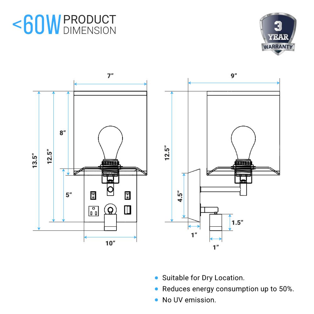 | Wattage: | 1 x 60W (Bulb Not Included) + 1 x 1W LED |