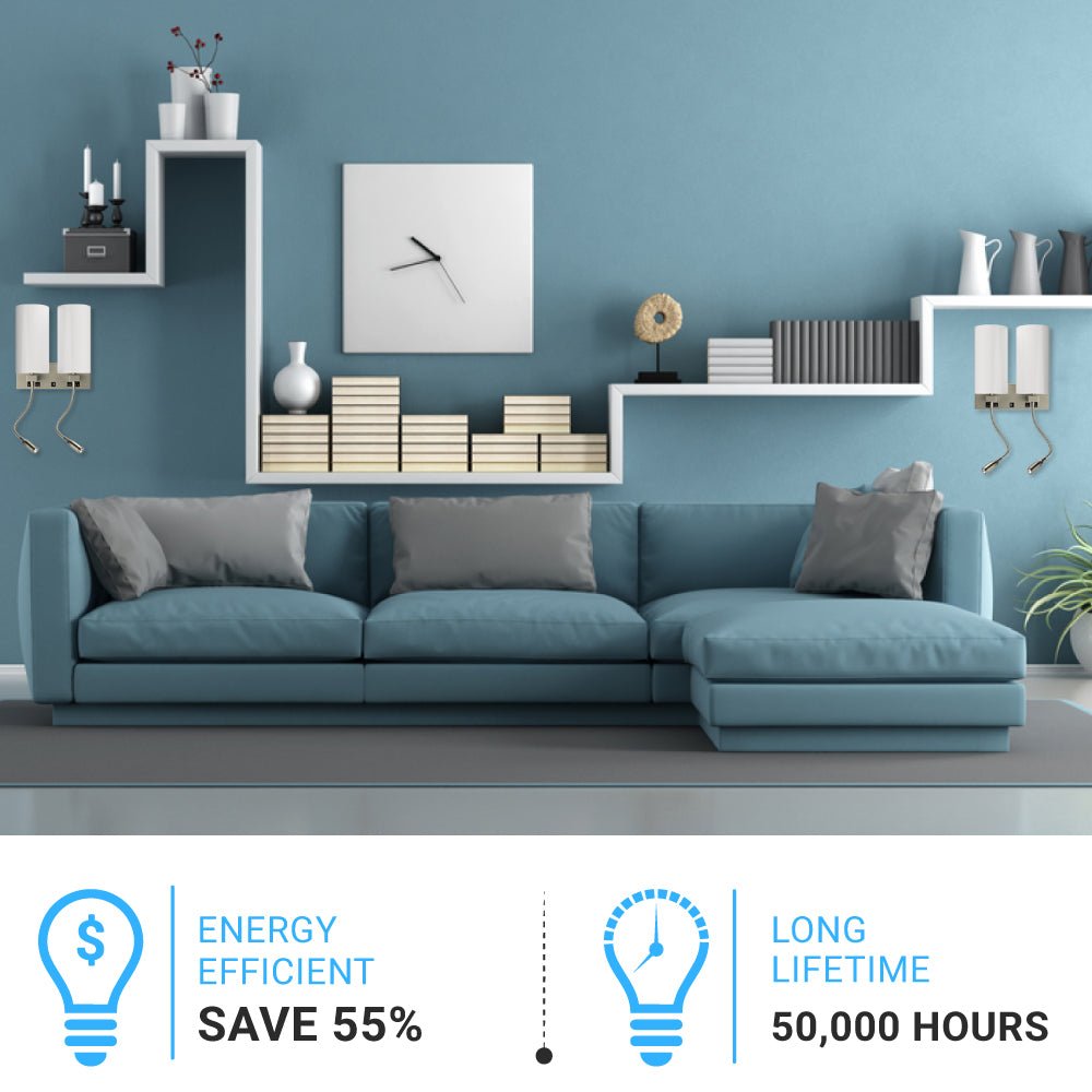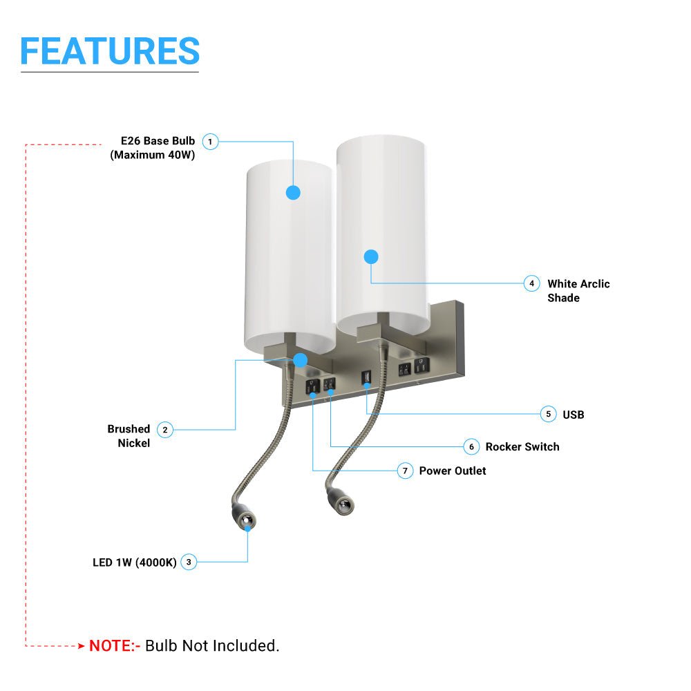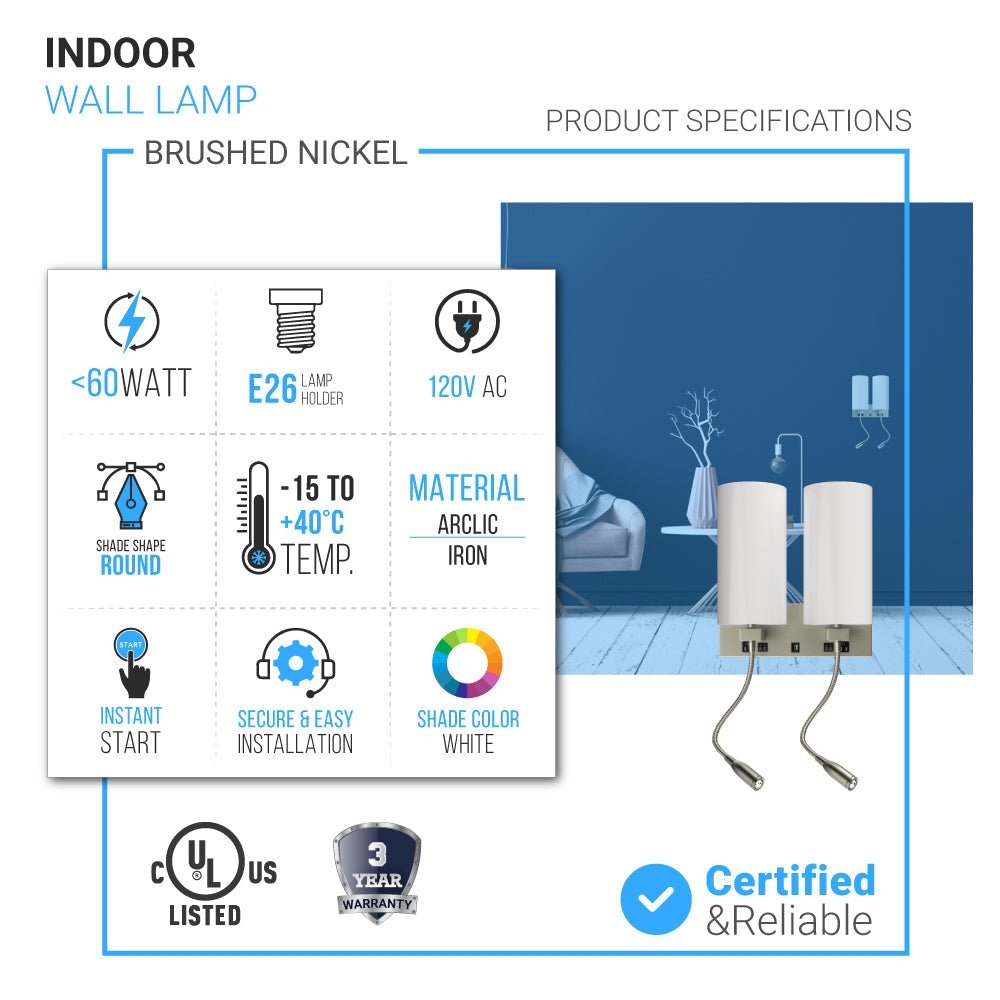 When it comes to the modern home and office decór, simple designs have the power to make an everlasting statement. Consider this decorative wall light fixture. It highlights an elegant cylindrical design that will blend with and adorn many different indoor settings. Measuring W14"*H12"*E7.75", this lamp comes with a 6" acrylic shade. Since this lamp comes with two shades, it is ideal for installation in bigger rooms. The metal surfaces of this lamp highlight a rich brushed Nickle finish that will add more charm to your living or workspace. The lamp is UL certified, which means that it is ideal for use in dry indoor locations like living rooms, offices, bedrooms, dining areas, and other spades. It comes with two rocker switches (for lighting control), a USB port, and two power outlets (for charging electrical devices). The lamp is compatible with A19 style bulbs that have an E26 base. Also, this wall lap fixture will need a 120V AC power supply and two bulbs under 40 watts. It will be best if you consider installing an LED bulb with this wall light fixture. As LEDs are available in several color temperatures and wattages, it is easier for you to find the perfect match for this lamp.