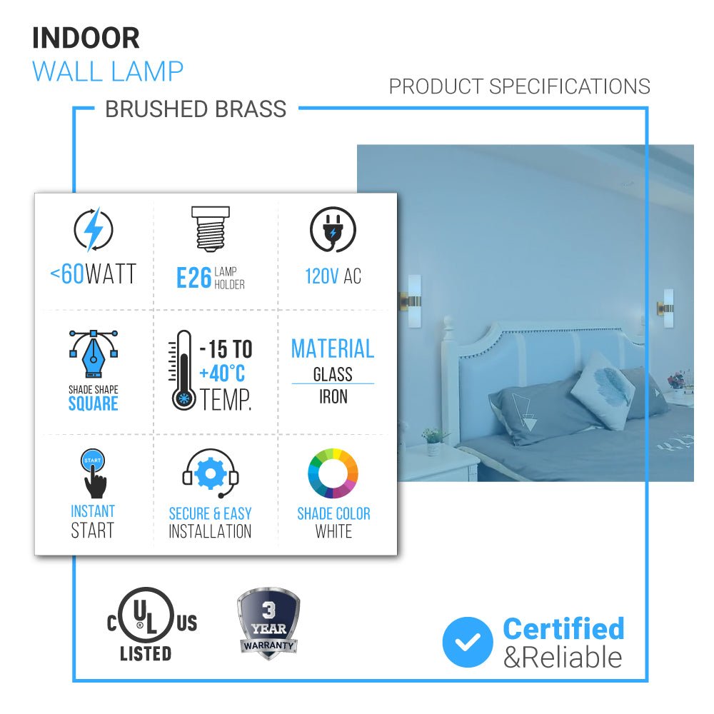 2 Lights-LED Wall Sconce W/ Frosted Glass Shade - E26 Base - UL Listed, Brushed Brass Finish