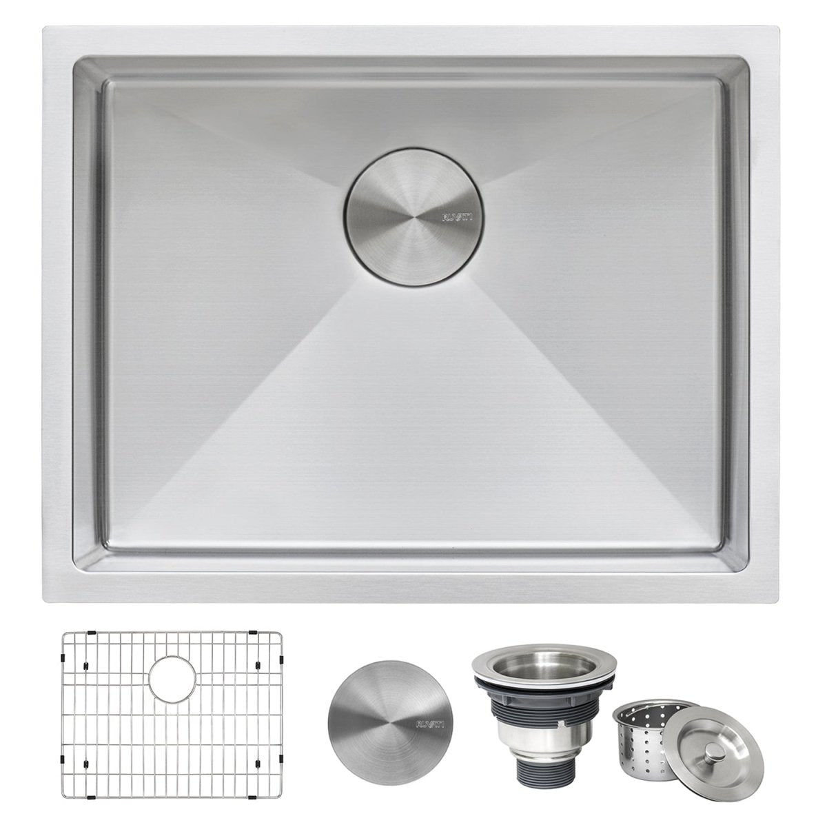 Included in the box: Sink, cut-out template, mounting brackets, rinse grids (set of 2), 2 basket strainers