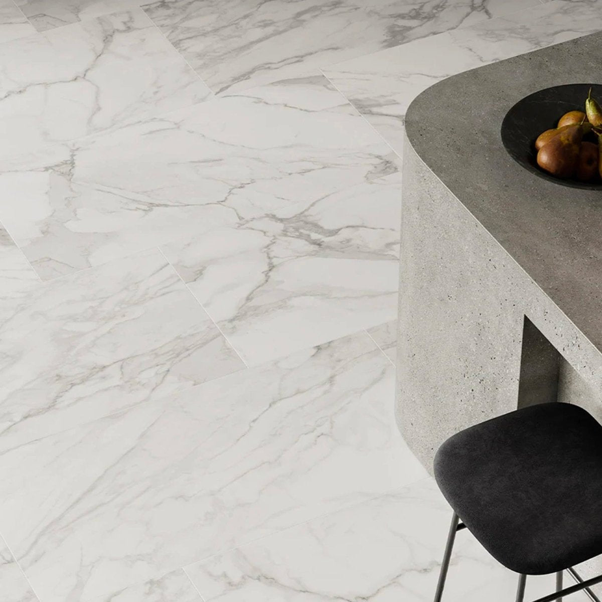 The Plata Statuario Brina Polished Rectified Glazed Porcelain Wall Tile is ideal for any area in the house. With its neutral marble tones, it creates a lovely contrast to hardwood furnishings. This collection's silvery grey veining sets it apart from other tiled floorings, making it appropriate for more modern interiors with a young aesthetic. The silvery-white Plata Statuario Brina Polished wall tiles will add a touch of luxury to your home. This tile will cordially welcome guests into your area and invite them to explore and experience everything that awaits them in this pleasant haven of luxury.