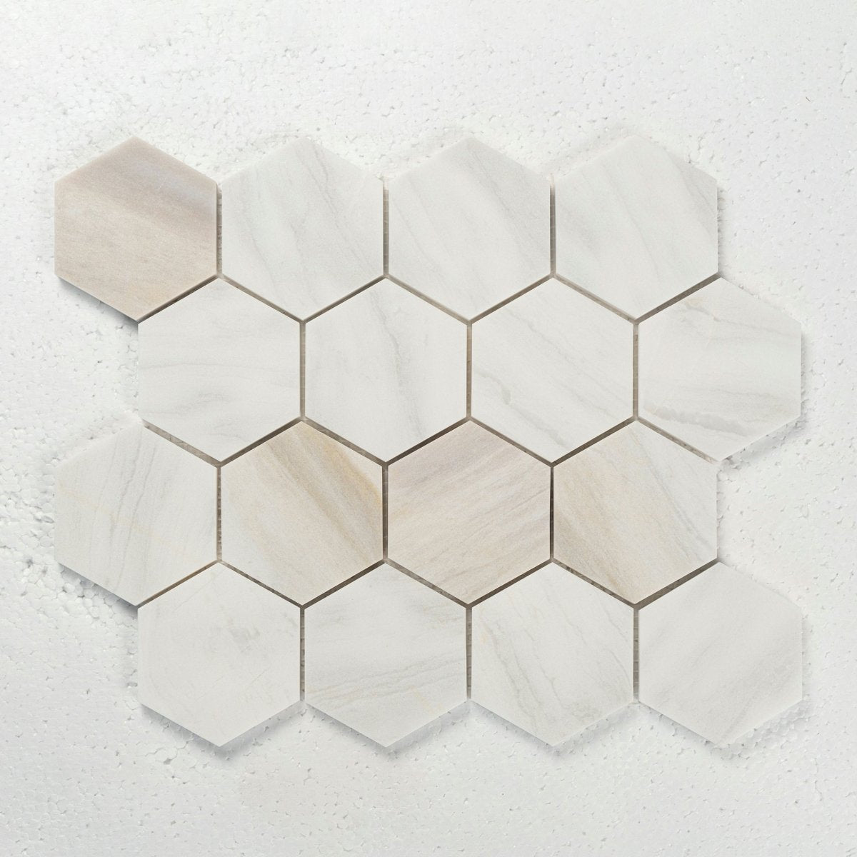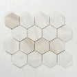 3 in. Hexagon Calacatta Rainbow Gold/ Yellow Polished Marble Mosaic - Case is backordered and will ship as soon as it is back in stock.