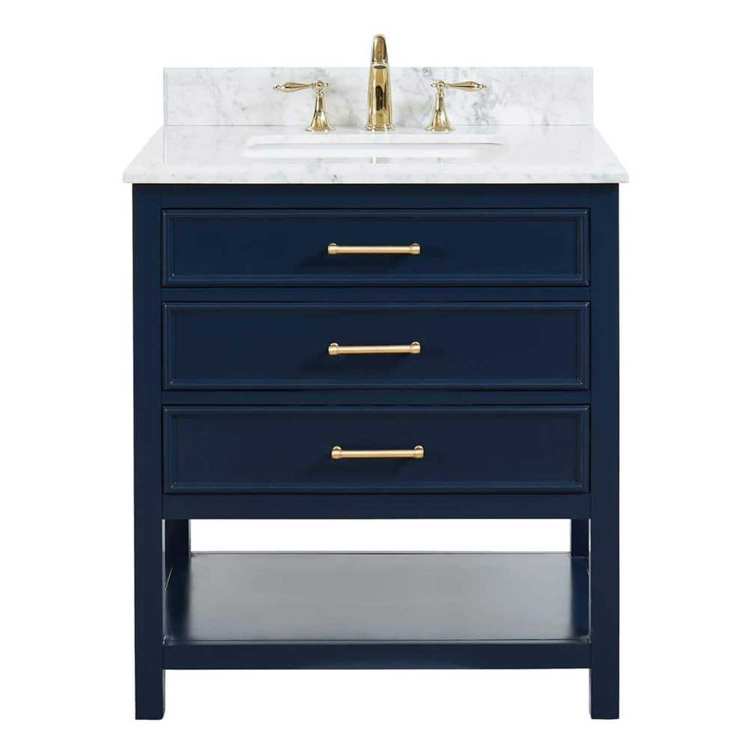 30" Manhattan Freestanding Solid Wood Bathroom Vanity in Navy Blue with Natural Carrara White Marble Sink Top with 4 In. Backsplash