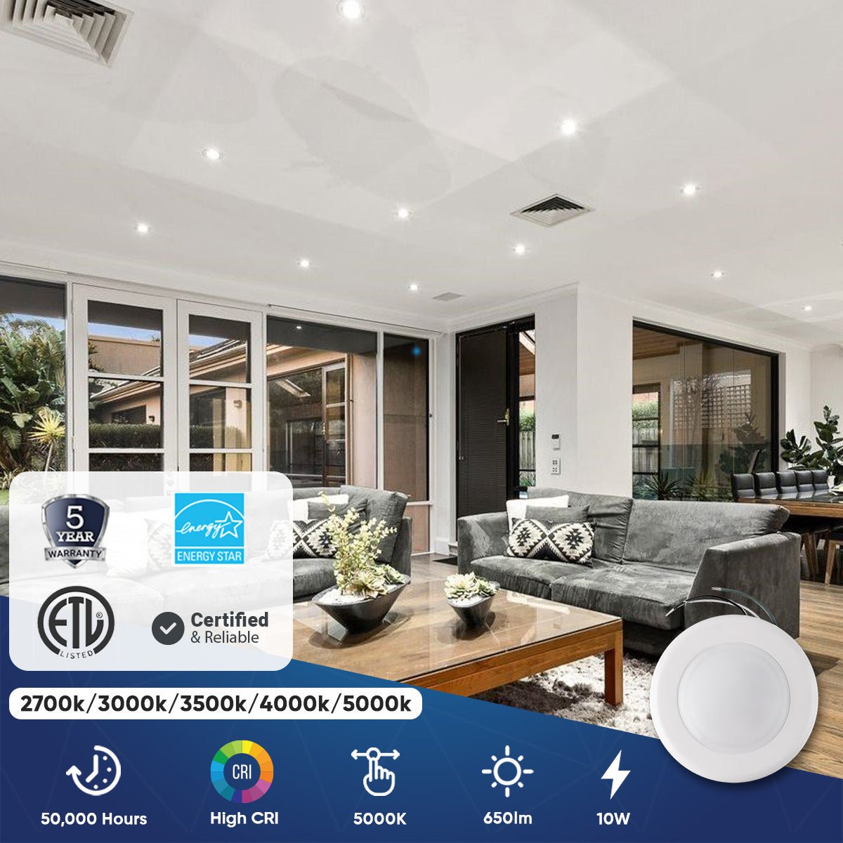 4" Dimmable LED Disk Downlight - 650 Lumens - 10 Watt - 35W Equal - 2700K/3000K/3500K/4000K/5000K - Aluminum smooth trim Design - 5 Year Warranty
