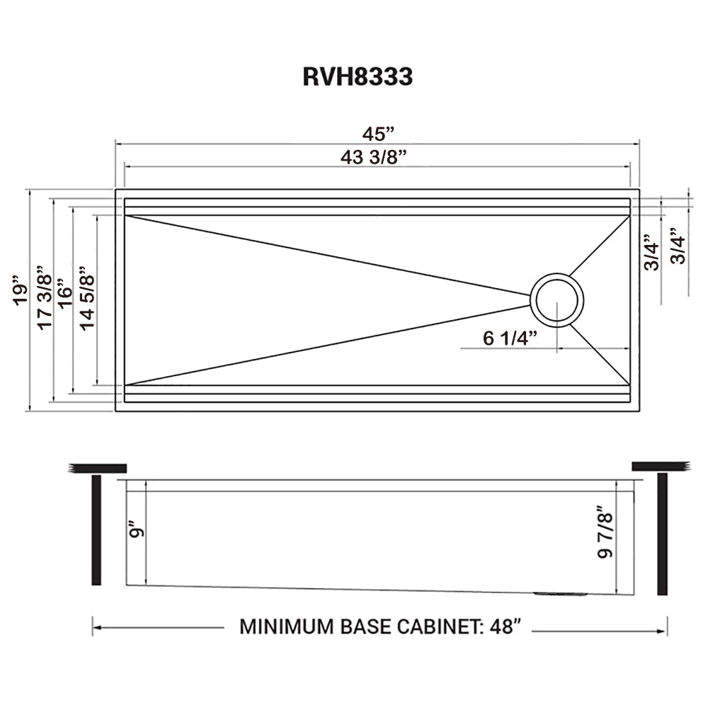 - Interior bowl dimension: 43-3/8" (wide) x 14-5/8" (front-to-back)