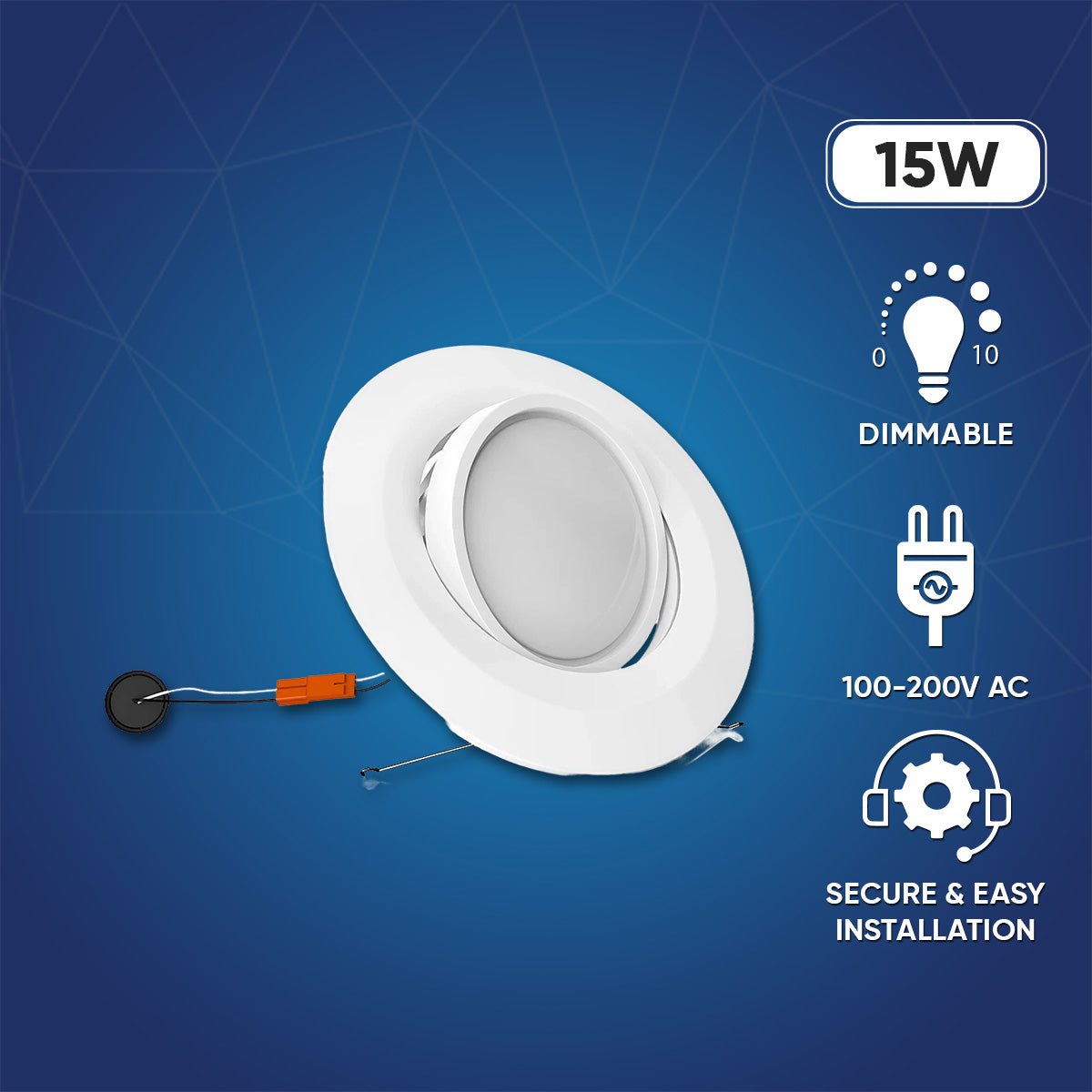 With a recessed base, the 5-6inch the LED eyeball dimmable downlight of 15W available in 3000K and 5000K color temperatures helps beam angle adjustment (the beam angle being 100-degree) like the movement of an eyeball a unique feature that allows for light to be distributed in areas where it is required the most. A CRI of 90+ means excellent color rendering by this downlight when the objects and surfaces appear as natural as they would in natural light. This 15W eyeball LED downlight can conveniently replace 55W of dimmable halogen light. On an average, the dimmable LED Downlight cuts down your utility bill by almost 88% and that's a significant amount of energy savings. With a long lifespan, this downlight beats the conventional halogen lights or incandescent light in terms of energy efficiency. These 5/6 inch recessed ceiling light fixtures can be fixed both in 5 inches and 6 inches of ceiling space respectively.