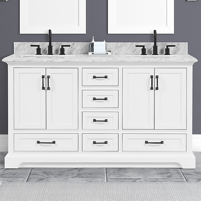 60" Rhoda Freestanding White Solid Wood Bathroom Vanity with Natural Carrara White Marble Double Sink Top with 4 In. Backsplash is backordered and will ship as soon as it is back in stock.