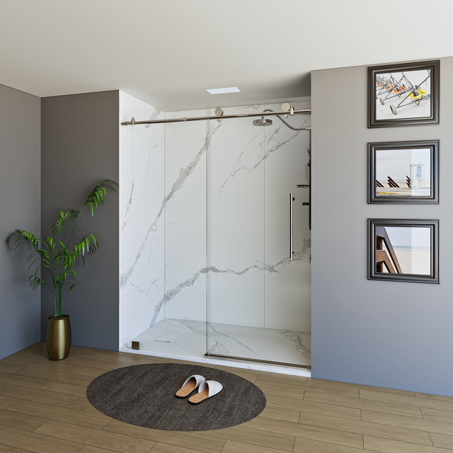 60" x 76" Frameless Sliding Shower Door, solid surface Shower Base Tray with covered drain, and 5pc Shower Wall System