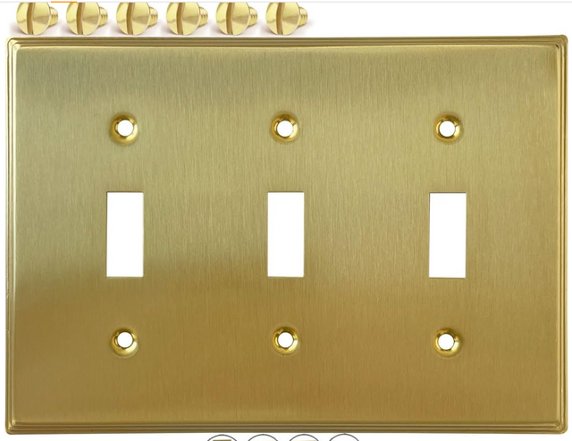 - Receive: (1) METAL Triple Toggle Light Switch Cover - 3 Gang - 5" x 6.87" - gold screws included.
