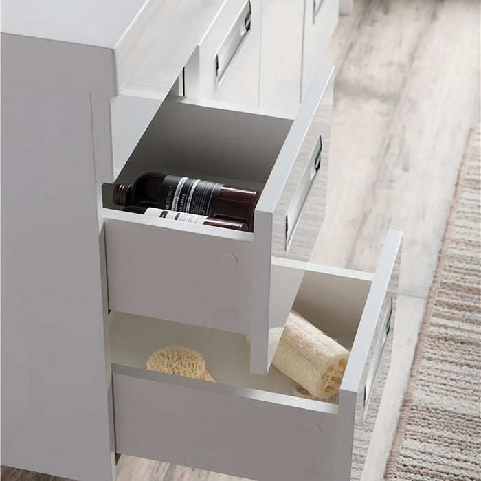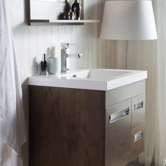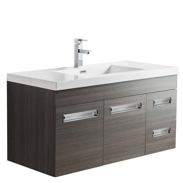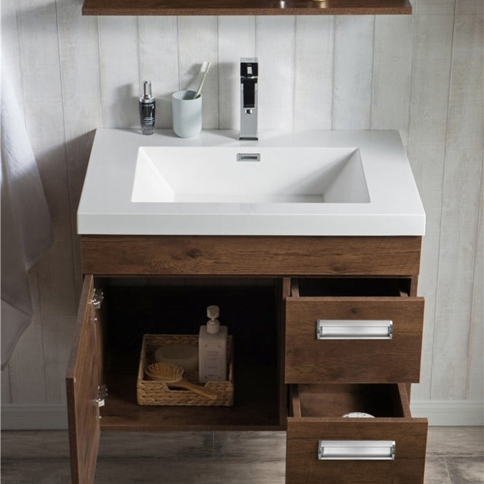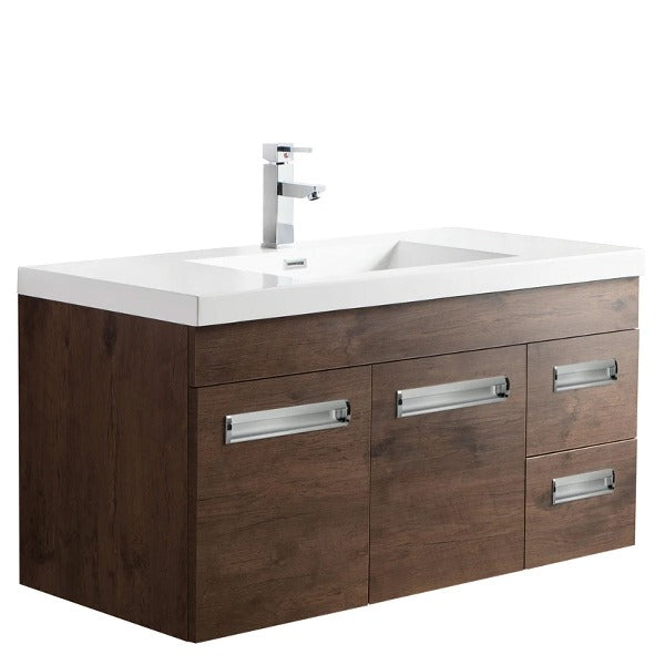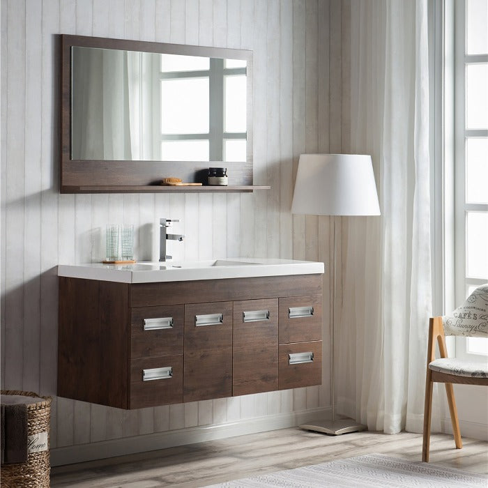 Add style to your bathroom space by introducing the wall mounted bathroom vanity with an acrylic composite vessel sink and a coordinated European delicate shutting cabinet for putting away washroom basics. A cubby-opening is effectively open to all that you store, toiletries and so forth, without compromising any usefulness. It comes wholly collected for quick and simple establishment. This mounted vanity is incredibly alluring because of its extraordinary plan. This vanity is accessible in different sizes 24", 30", 36", 42", 48", 60", 72" and 84" and colors gray oak, high gloss white, and rosewood so you can pick any bathroom vanity as per your washroom requirements. For a durable and consistent feel, the veneered medium-thickness fiberboard cupboards are done in different shadings to commend the white acrylic top. It has a low-upkeep surface that is scratch-safe, stain-safe, and microscopic organisms safe. This bathroom vanity is excellent in design and is profoundly tough.