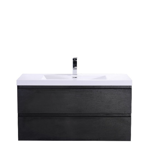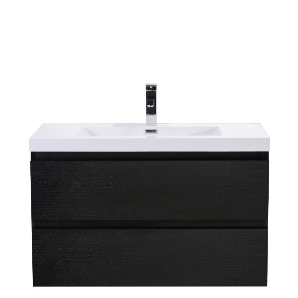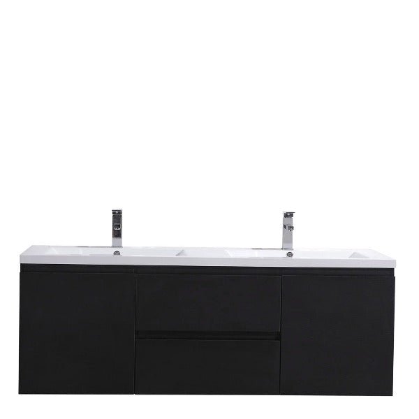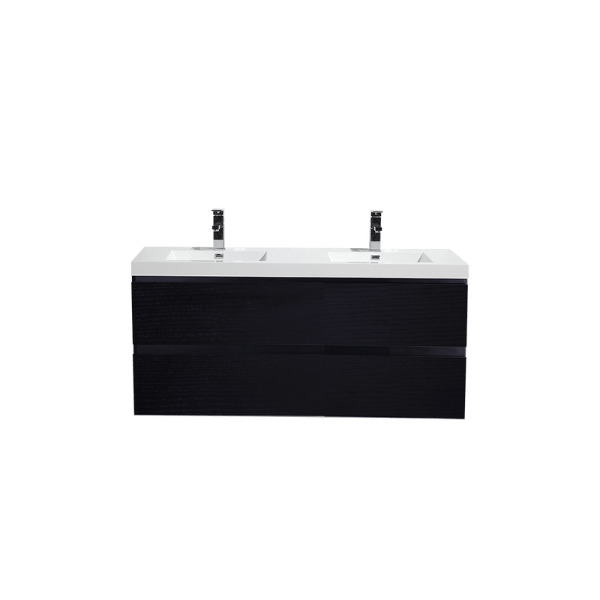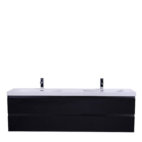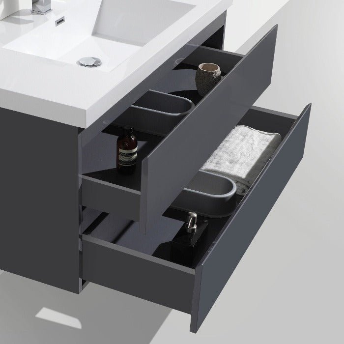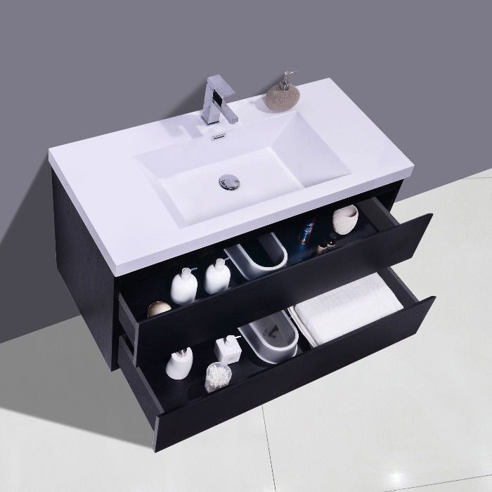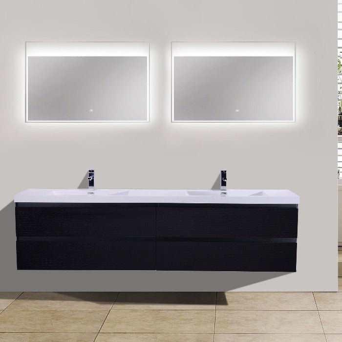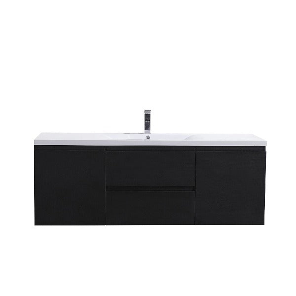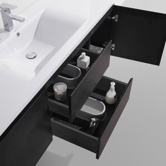 With its wall-mounted seamless style, the Brooklyn series complements and elevates every modern bathroom with its wall-mounted seamless style. For a seamless look, a rectangular basin sink is inserted into the reinforced acrylic counter. Medium soft-close drawers are built into the moisture and water-proof foundation, providing adequate storage for toiletries and towels. This vanity comes fully installed, making installation a breeze. This bathroom vanity makes your bathroom look stylish and modern. The Wall Mounted Brooklyn Bathroom Vanity is available in 24", 30", 36", 42", 48" Double Sinks, 48", 60" Double Sinks, 60", 72" Double Sinks, and 84" Double Sinks size variations and comes with a Rich Black finish with a complimentary White Acrylic Top. It has a low-maintenance surface that is scratch-resistant, stain-resistant, and bacteria-resistant. We are committed to reducing its environmental impact by creating and delivering a safe and exclusive product for you, whether it's for your business or home. Multi-stage finishing ensures the modern bathroom vanity's longevity and efficiency.