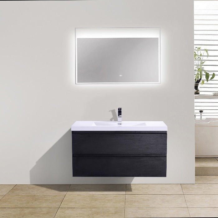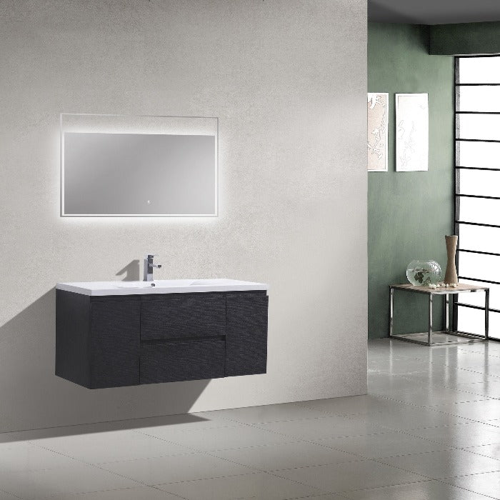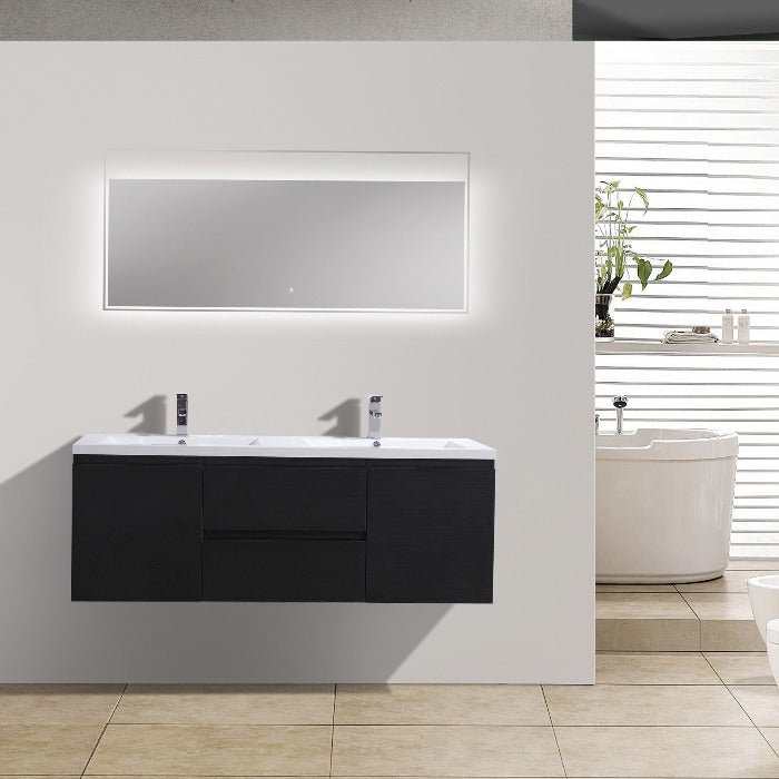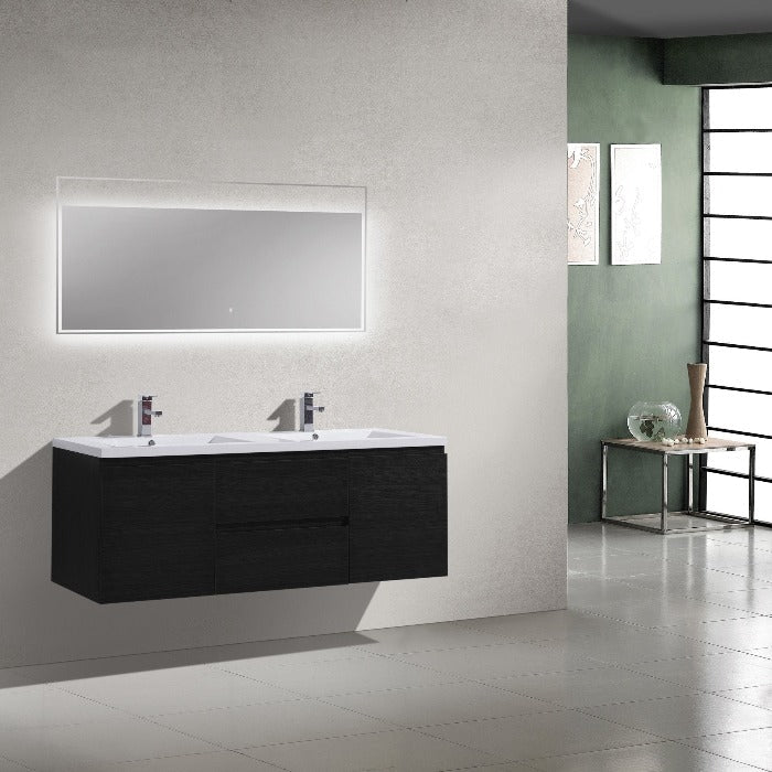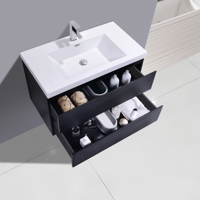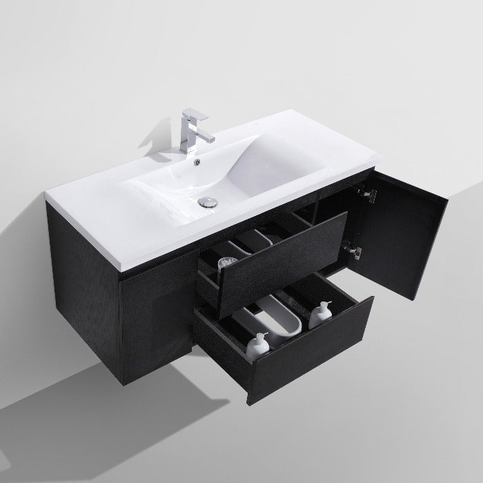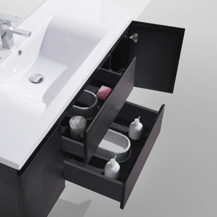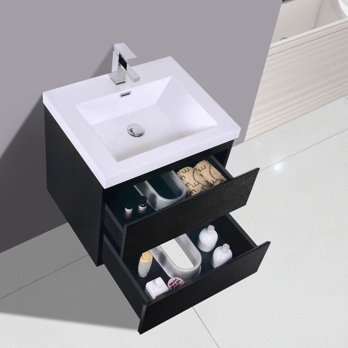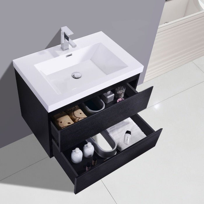 With its wall-mounted seamless style, the Brooklyn series complements and elevates every modern bathroom with its wall-mounted seamless style. For a seamless look, a rectangular basin sink is inserted into the reinforced acrylic counter. Medium soft-close drawers are built into the moisture and water-proof foundation, providing adequate storage for toiletries and towels. This vanity comes fully installed, making installation a breeze. This bathroom vanity makes your bathroom look stylish and modern. The Wall Mounted Brooklyn Bathroom Vanity is available in 24", 30", 36", 42", 48" Double Sinks, 48", 60" Double Sinks, 60", 72" Double Sinks, and 84" Double Sinks size variations and comes with a Rich Black finish with a complimentary White Acrylic Top. It has a low-maintenance surface that is scratch-resistant, stain-resistant, and bacteria-resistant. We are committed to reducing its environmental impact by creating and delivering a safe and exclusive product for you, whether it's for your business or home. Multi-stage finishing ensures the modern bathroom vanity's longevity and efficiency.