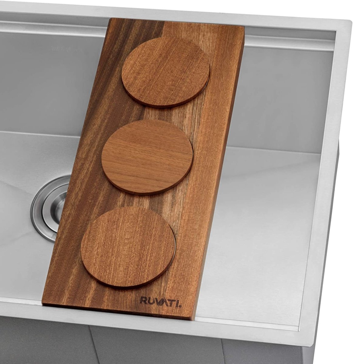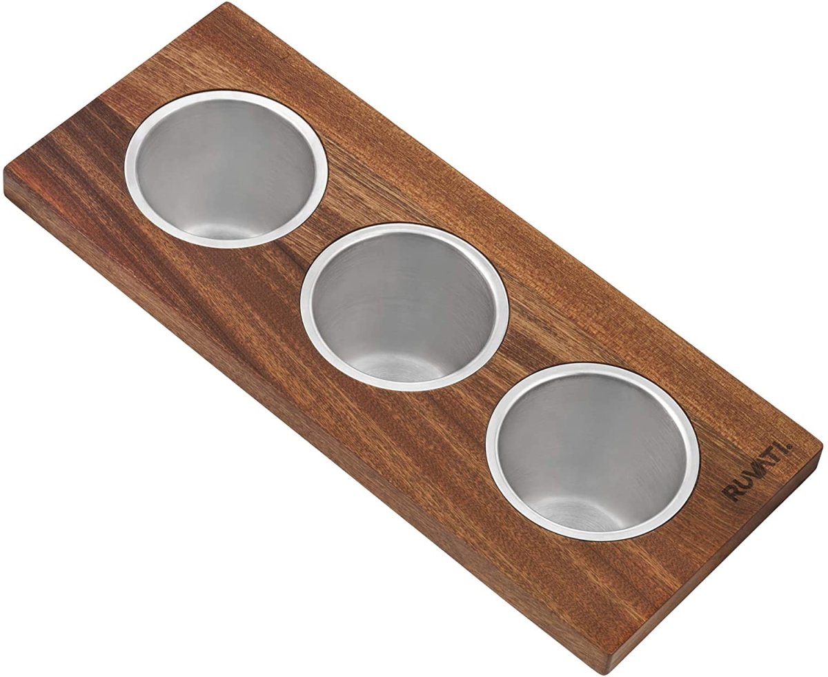 This 3 bowl condiment tray from Ruvati adds to the functionality of your workstation sink. Now you can prepare your condiments or sauces and serve them right on top of your sink. No more messy countertop; all the mess stays on the sink, and can be easily rinsed off with your faucet sprayer. The platform is designed to fit all Ruvati workstation kitchen sinks including single tier (Roma, Verona and Siena series) as well as dual tier workstation sinks. The solid Mahogany wood platform sits on the ledge of your workstation sink. Unlike bamboo, solid hardwood is a lot more durable in wet conditions, and does not warp or crack. The set includes three deep stainless steel bowls and matching wooden lids. The three bowls are made of food-safe, corrosion proof T-304 grade stainless steel, and can be nested for easy storage. All the added utility of this set makes it a perfect addition to any home chef's kitchen.