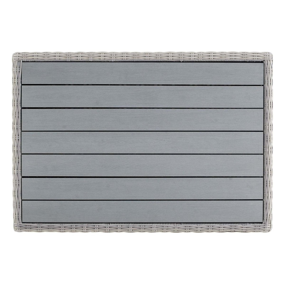 Enjoy fresh air and alfresco relaxation with the Conway Outdoor Patio Wicker Rattan Coffee Table. Wrapped in UV-resistant light gray synthetic wicker rattan, this patio table boasts organic texture and a neutral hue that brings a calming presence to your outdoor space. The frame of this outdoor coffee table is crafted with durable powder-coated aluminum and rests on L-shaped legs with plastic foot glides. A planked tabletop that replicates the texture of wood offers the perfect place to rest a drink or plate while entertaining. Trending aesthetics and a classic design define this outdoor patio furniture collection making it a beautiful addition to any outdoor space including the backyard, patio, porch, balcony, or poolside.