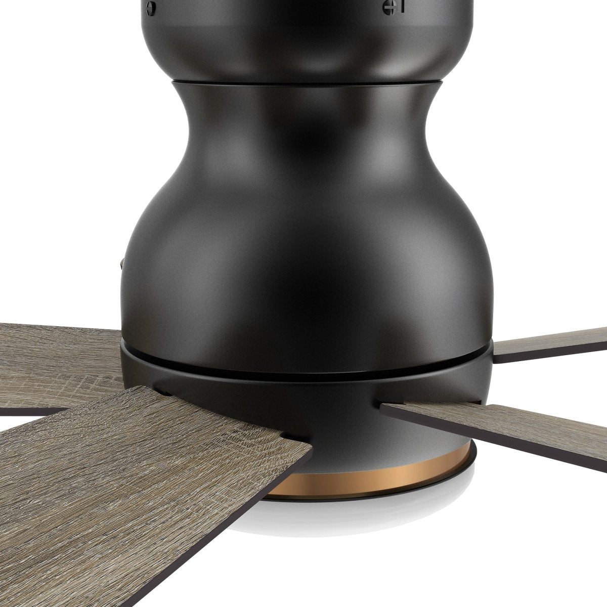 Dubois Smart Ceiling Fan with 5 blades and a 48-inch blade sweep with a flush mounted motor case and tropical inspired blades. The wide paddle shaped fan blades are reversible and two different wood blades. The motor case is a soft matte black finish and one of our low profile flush mounted DC motor fans. A dimmable 3500K LED lighting kit that can change between bright white, soft warm light, and a combination of both for a neutral temperature. The frosted glass LED light shade is adorned with gold finish detail that adds a touch of sophistication to the ceiling fan. The fan features Remote control, Wi-Fi apps, Siri Shortcuts, and Voice control technology (compatible with Amazon Alexa and Google Home Assistant ) to set fan preferences.