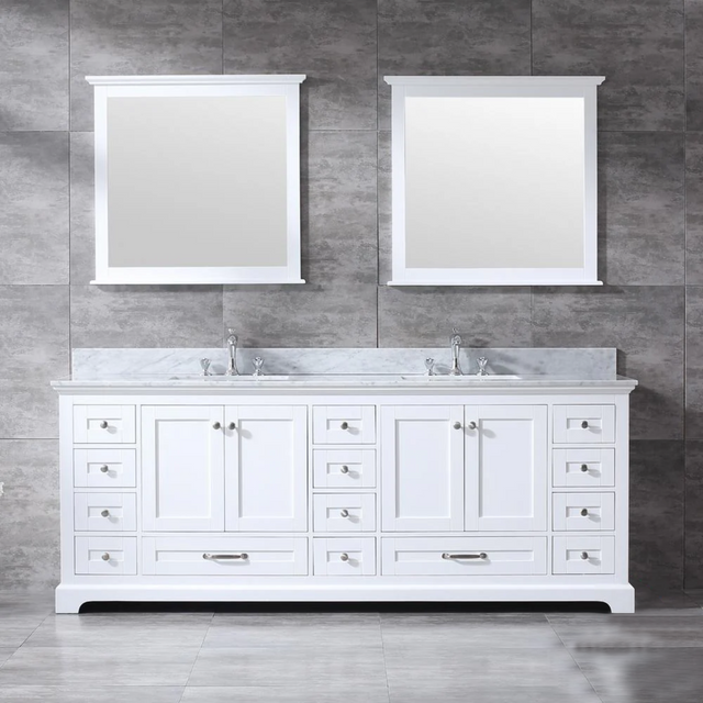 Dukes 84-Inch Freestanding White Bathroom Vanity with Double Undermount Ceramic Sinks, White Carrara Marble Top, and matching 34-Inch Mirrors - Exceptional blend of style, functionality, and practicality in the form of an exceptional, high-quality bathroom solution to elevate larger bathrooms through an ample amount of shared usage while still being style and luxurious. Sleek white finish with a stunning piece of Carrara marble for an unbeatable, timeless centerpiece of any bathroom style.