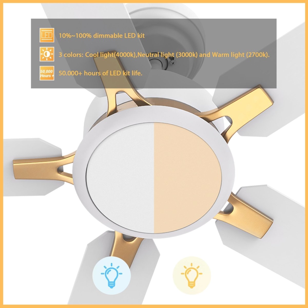 This Carro ESPEAR 52'' smart ceiling fan keeps your space cool, bright, and stylish. It is a modern masterpiece perfect for your indoor or outdoor living spaces. This Wi-Fi smart ceiling fan has a modern design with gold finish fan brackets that add a stylish touch. The fan blades are made of highly-compressed and ultra-durable plywood in crisp white finish. Its integrated 4000K LED light kit is guaranteed to provide you a comfortable lighting while being energy efficient. The fan features Remote control, Wi-Fi apps, Siri Shortcuts and Voice control technology (compatible with Amazon Alexa and Google Home Assistant ) to set fan preferences.
