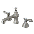 The graceful elegance of timeless design is beautifully merged between British flair and Victorian delicacy within this faucet's white porcelain levers. Ideal for more spacious bathrooms, widespread faucets are more spread apart and feature a 3-hole installation. The Bel-Air 8-inch widespread bathroom faucet with brass pop-up and its featured sturdy brass construction and premium brushed nickel finish are guaranteed to glamorize your home's traditional ensemble for years to come. Varnish your bathroom with this state-of-the-art fixture. A matching finish drain is also included.