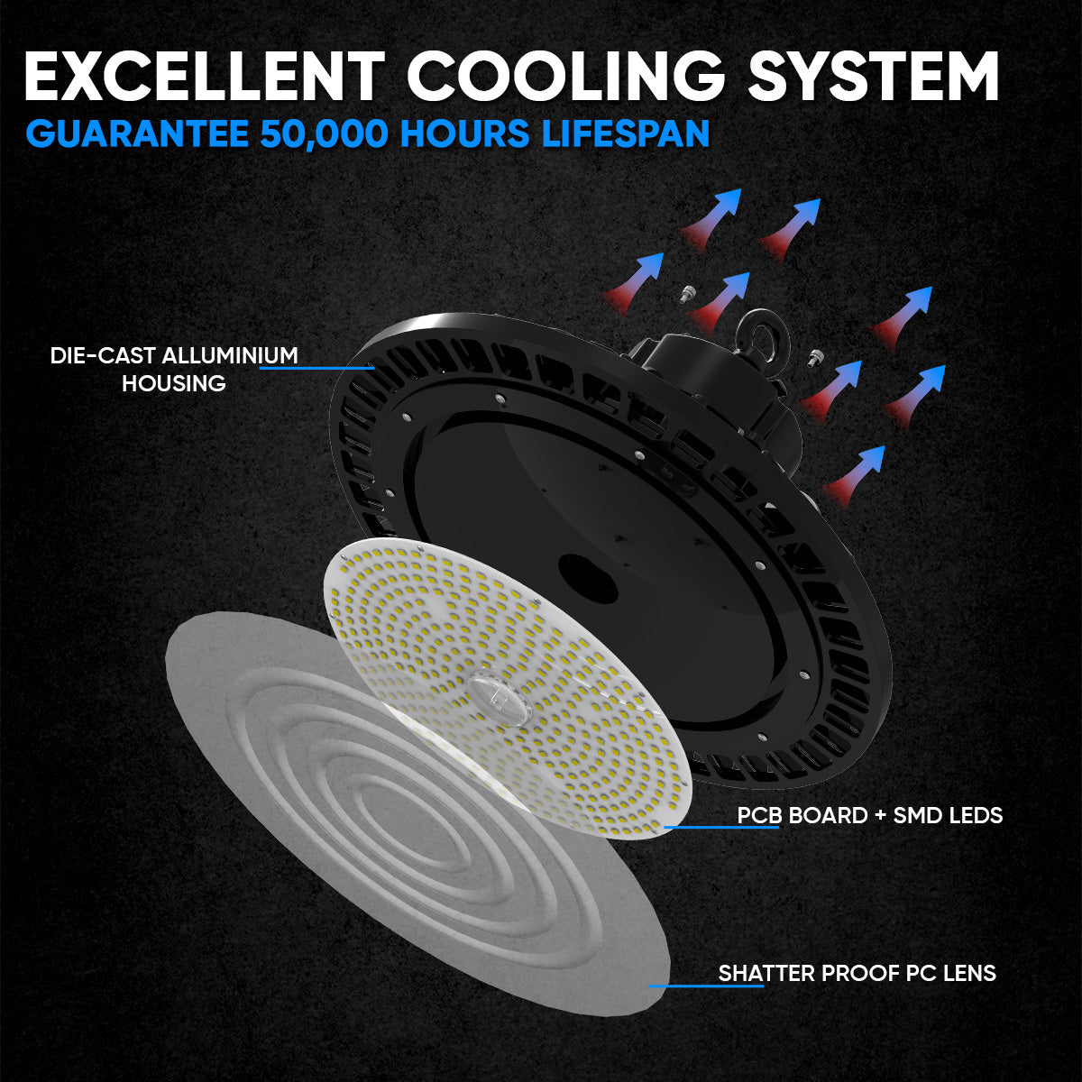 The UFO high bay lighting fixtures have an inbuilt aluminum heatsink which accounts for excellent heat dissipation giving these lights a longer lifespan and better performance.