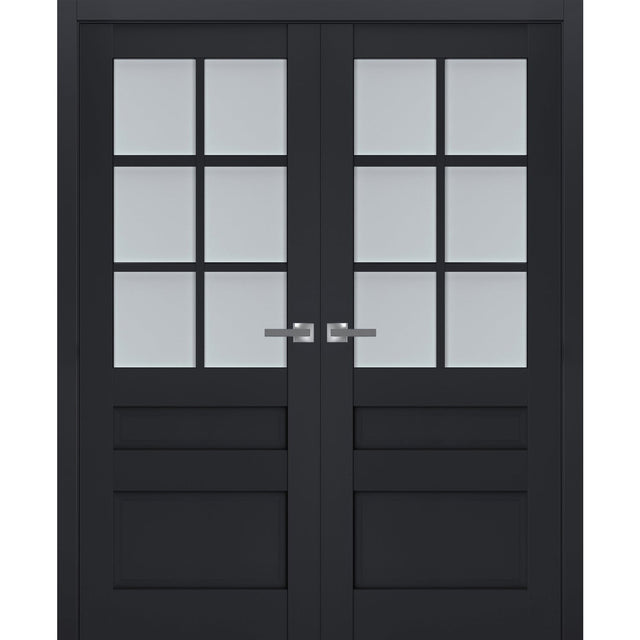Interior Solid French Double Doors | Veregio 7339 Antracite with Frosted Glass | Wood Solid Panel Frame Trims | Closet Bedroom Sturdy Doors