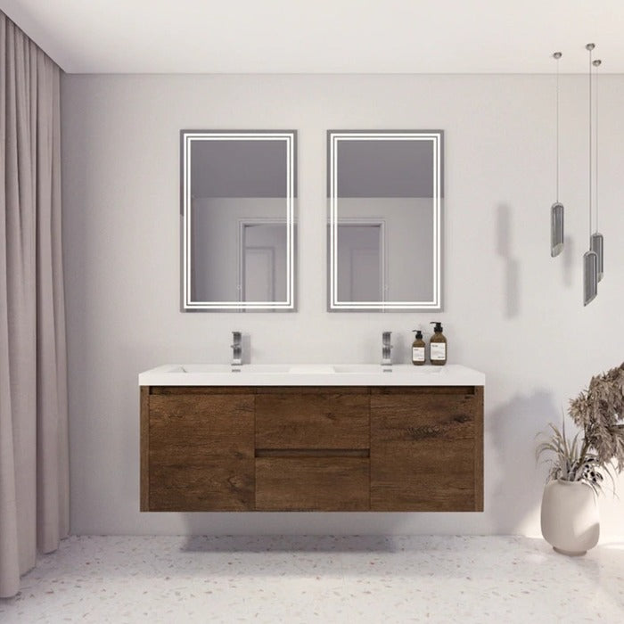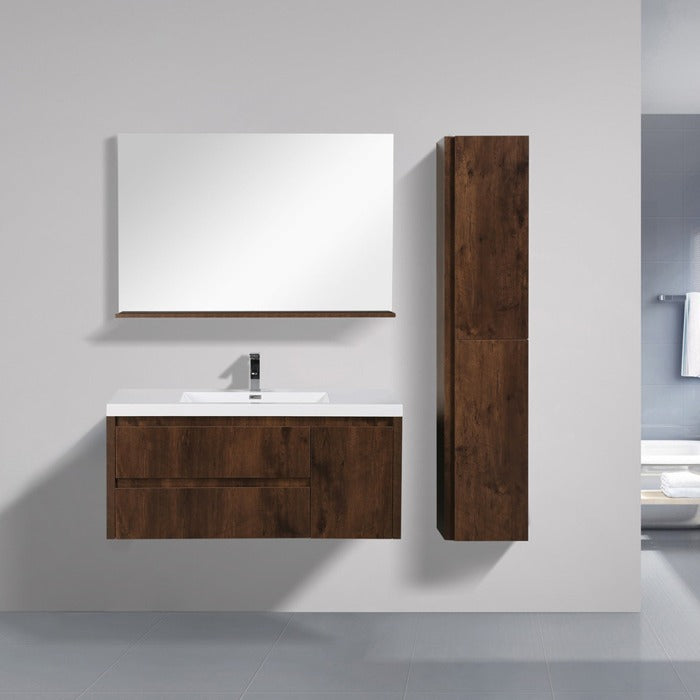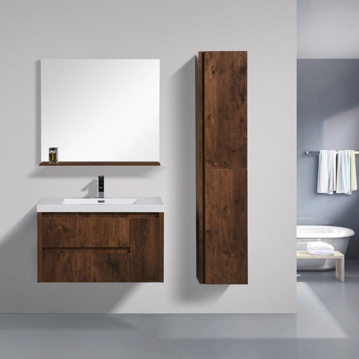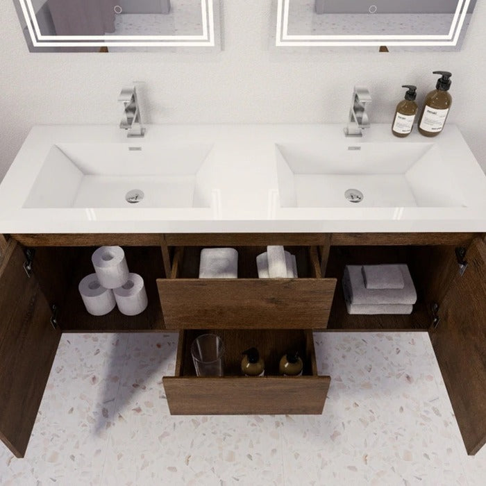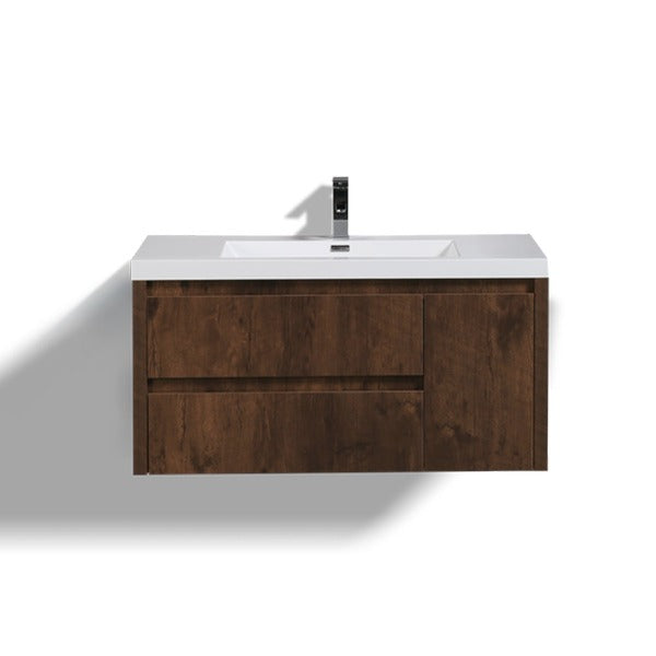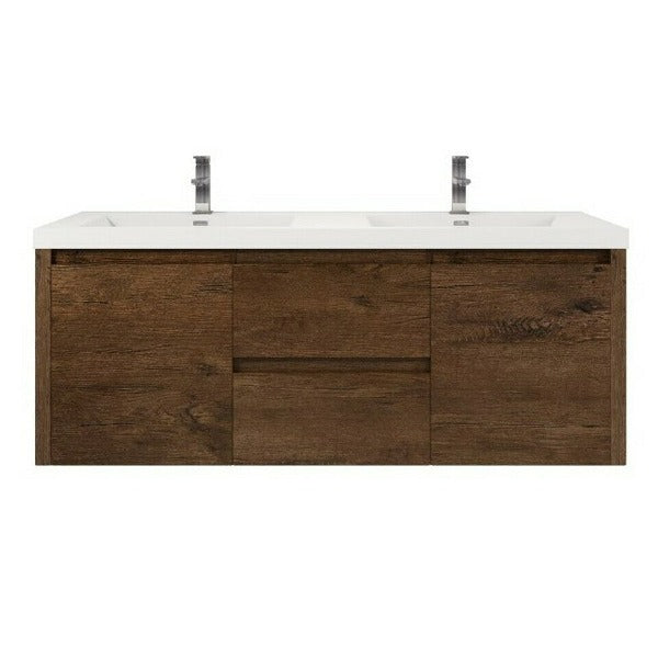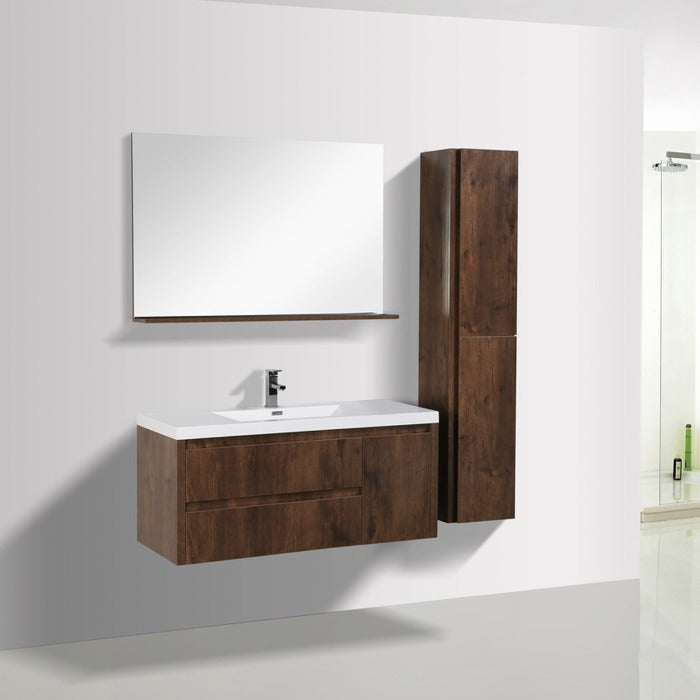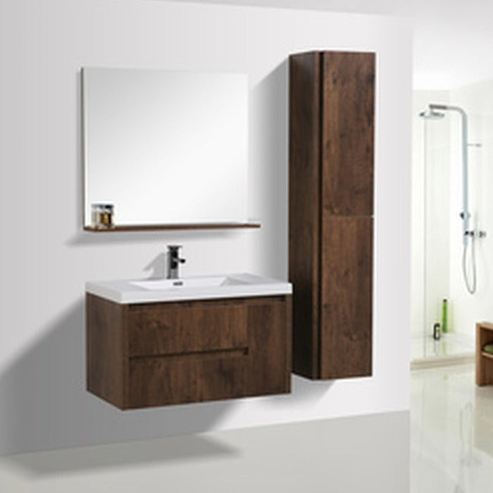 Introducing Jade wall mounted bathroom vanity with reinforced acrylic sink. This rectangular basin vanity comes in six sizes that are 36, 42, 48, and 60 D. You can opt for any size you want, depending upon the space in your bathroom vanity area. 60 D size is enabled with a double basin feature that gives you the comfort of utilizing two sinks. So, you can organize your vanity area for a clutter-free zone. This medium-density fireboard and acrylic material vanity set comes in two different colors: natural oak and rosewood.