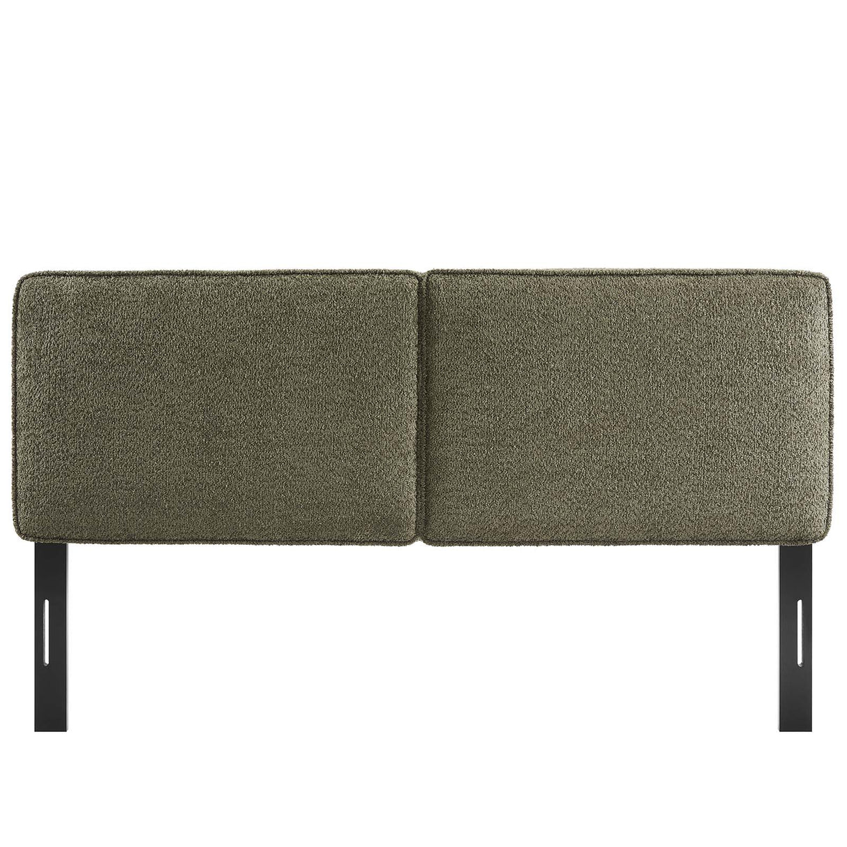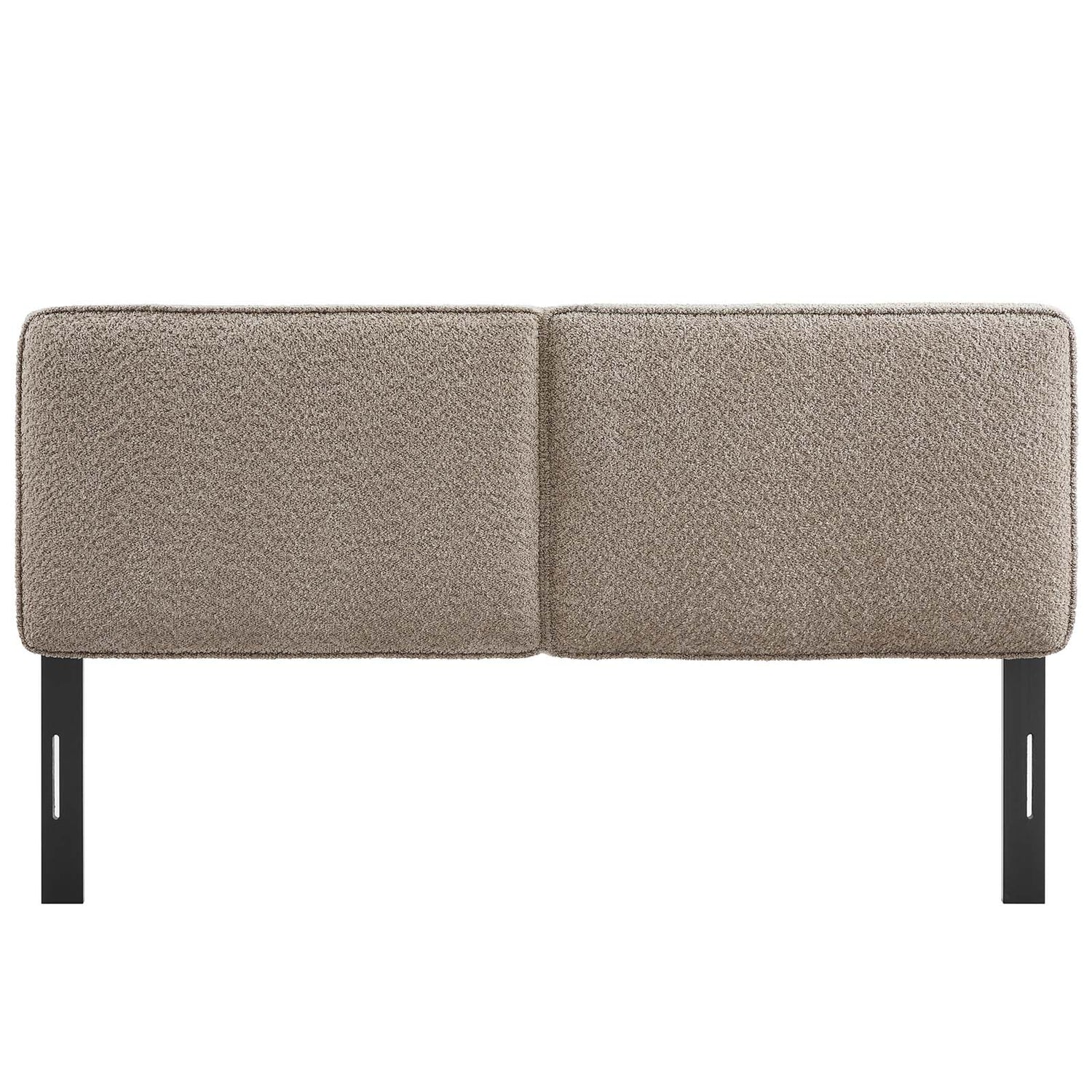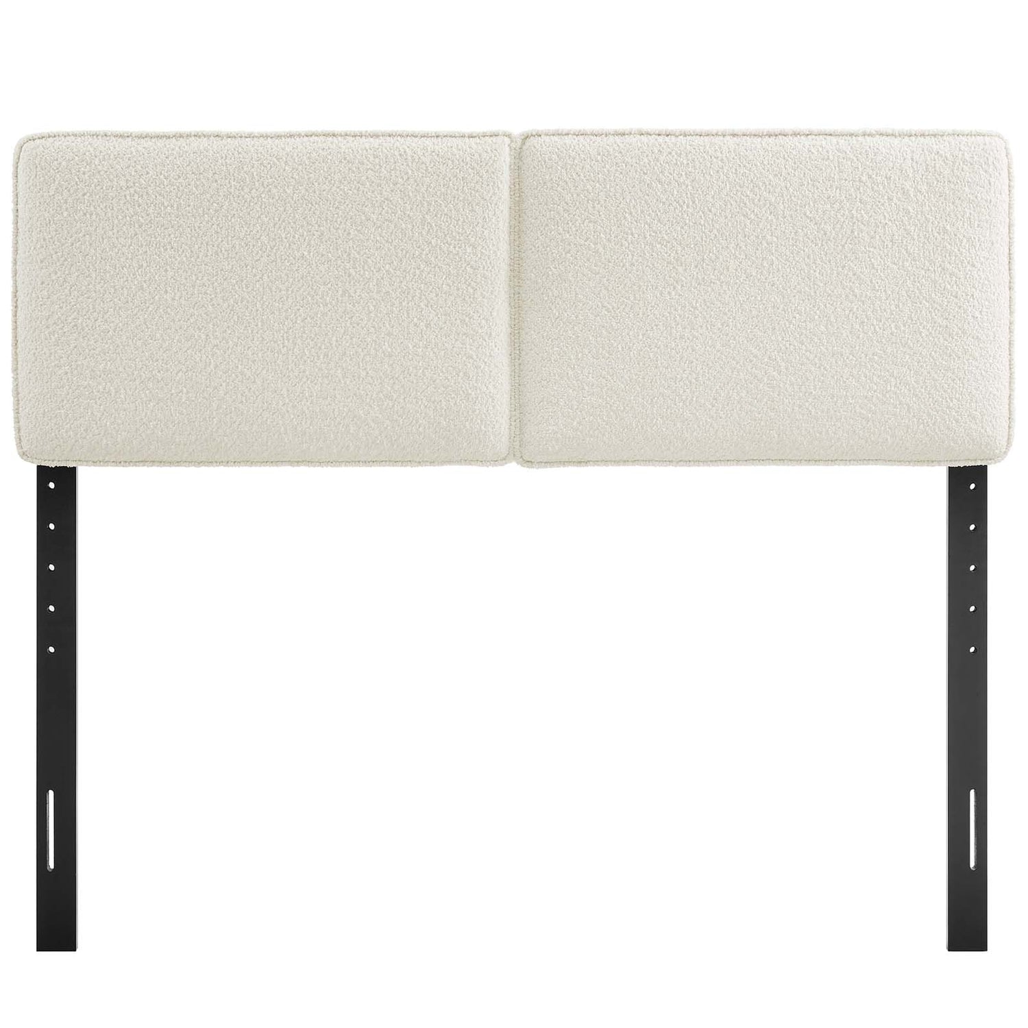 Embrace elegance and comfort in a primary bedroom or guest bedroom with the Lindee King Headboard, a statement piece that merges plush comfort with sophisticated design. This king size fabric headboard is upholstered in textured boucle fabric that offers a tactile charm, and features French piping trim that outlines the dual panels. The dense foam padding and pillow-style design grants a soft, cushioned backdrop for nightly reading or relaxing in bed. Supported by solid wood legs and equipped with seven mounting positions, this king upholstered headboard provides both durability and versatility to fit various bed frames. The Lindee king size headboard is a transformative bedroom upgrade that combines form and function with an upholstered boucle headboard appeal, making it a quintessential element for any restful sanctuary. Assembly required.