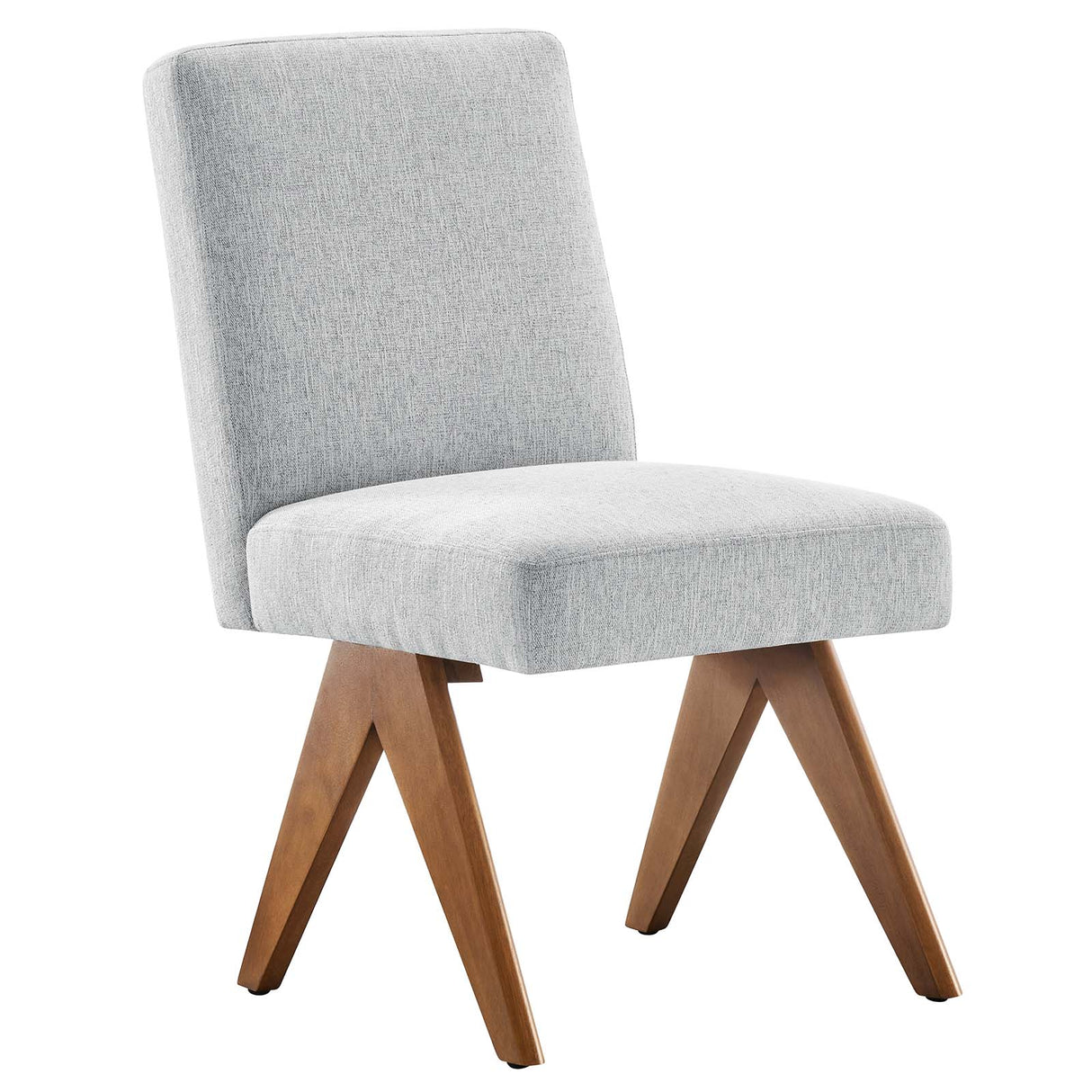 Add comfort and style to your home with Lyra Heathered Fabric Dining Side Chairs - Set of 2. These dining chairs are chic and luxurious, featuring a relaxed design with a subtly angled backrest. Lyra comes upholstered in woven heathered fabric, creating a comfortable resting spot where you can enjoy a meal or sip on a glass of wine. Featuring a sturdy plywood frame, inverted V-shaped rubberwood legs, and dense foam padding, these modern dining room chairs provide stability while enhancing the dining room, bedroom or entryway. Includes non-marking feet. Assembly Required. Weight Capacity: 331 lbs.