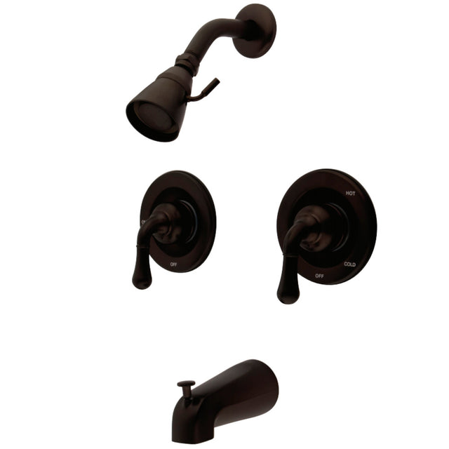The timeless appeal of this tub and shower faucet's sleek and simple design transforms any bathroom into a destination location. Complete with easy-to-turn lever Handles, an optimum bathing experience awaits. Enjoy the sturdy brass construction and premium oil rubbed bronze finish for a fixture that will last for years to come. A pressure balanced valve is included for safety and protection against accidental burns.