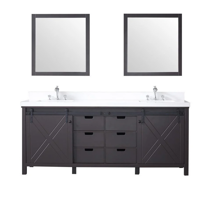 Marsyas 80" Brown Double Vanity, White Quartz Top, White Square Sinks and 30" Mirrors