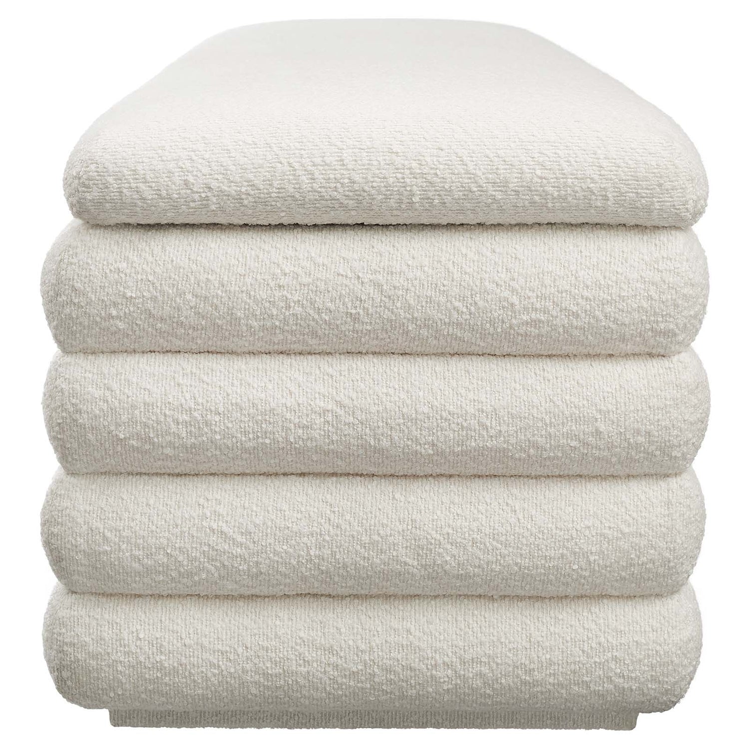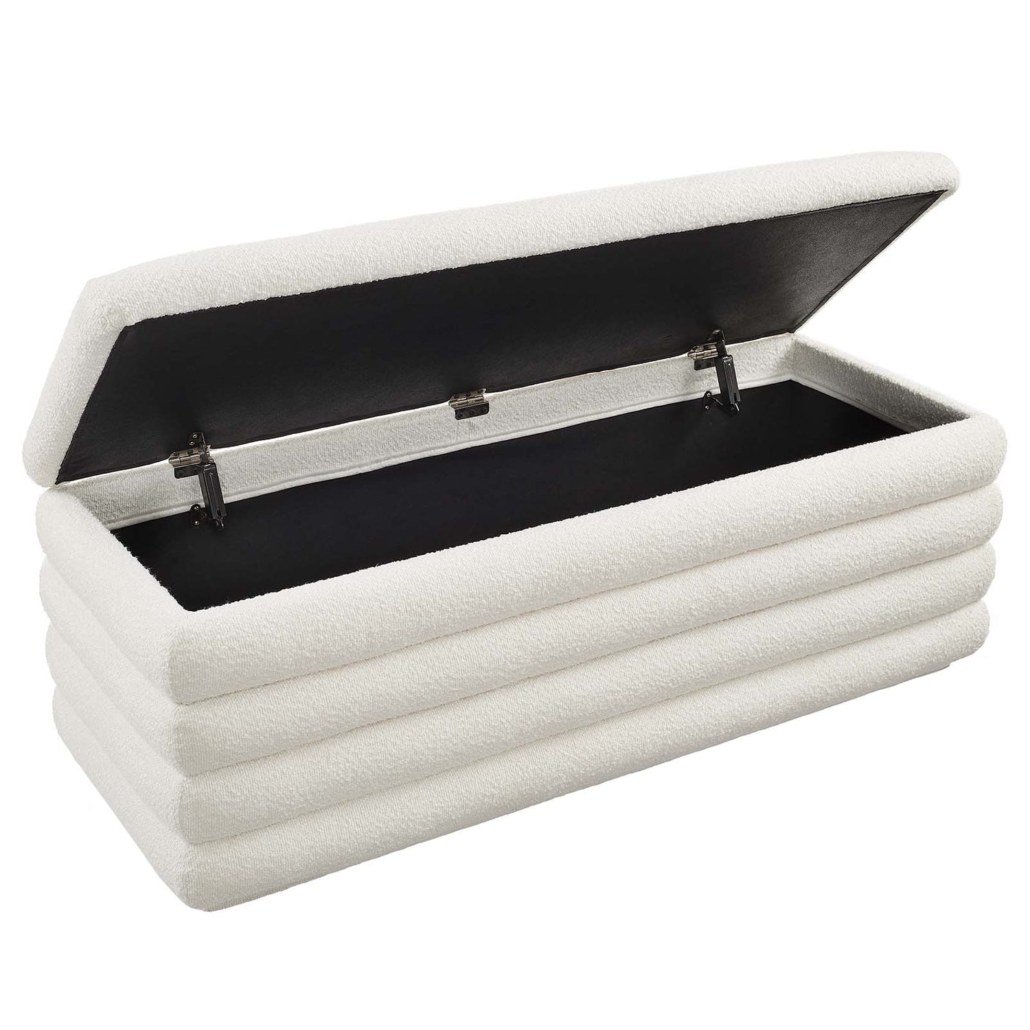 Elevate your home’s comfort and elegance with the Mezzo Boucle Upholstered Storage Ottoman. Padded with dense foam and wrapped in a nubby textured boucle fabric, this storage bench for the living room or bedroom is as practical as it is striking with its plush channel tufted detail. The stay-open hinge adds convenience, revealing a spacious storage area ideal for stowing linens, games, home accents, and more. Perfectly suited as a storage bench for the entryway or as a chic bed bench, Mezzo offers versatile use with its non-marking floor glides to protect your surfaces. Its robust design, coupled with the nubby texture of boucle, makes it a centerpiece in any room. Arriving fully assembled, this bedroom bench saves you time and effort, allowing you to instantly enjoy its splendor and spacious utility. Weight Capacity: 617 lbs.