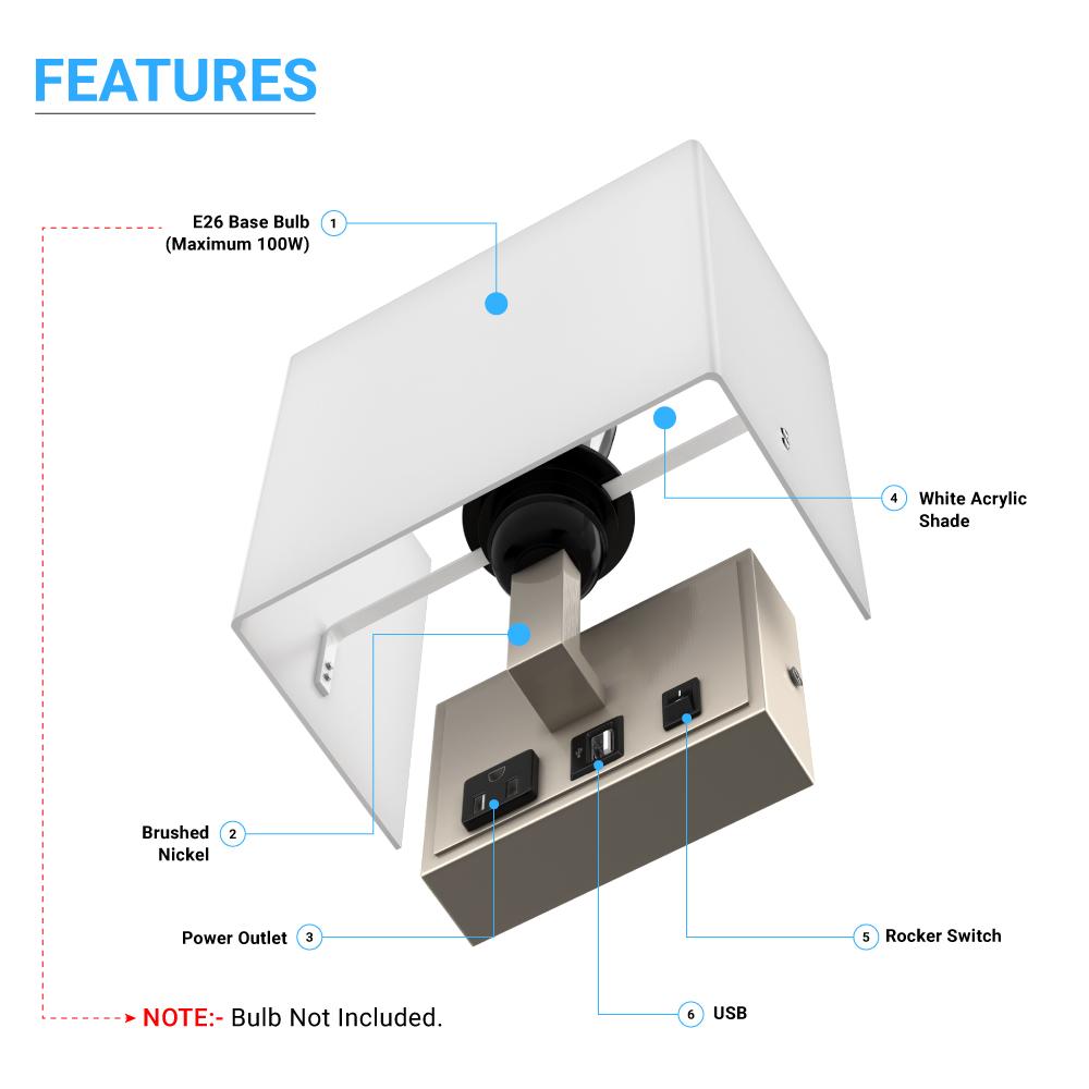Modern LED Wall Sconce With 1 USB, 1 Switch, 1 Outlet - UL Listed, Satin Nickel Finish W/ White shade - 1-Pack / Acrylic Shade is backordered and will ship as soon as it is back in stock.