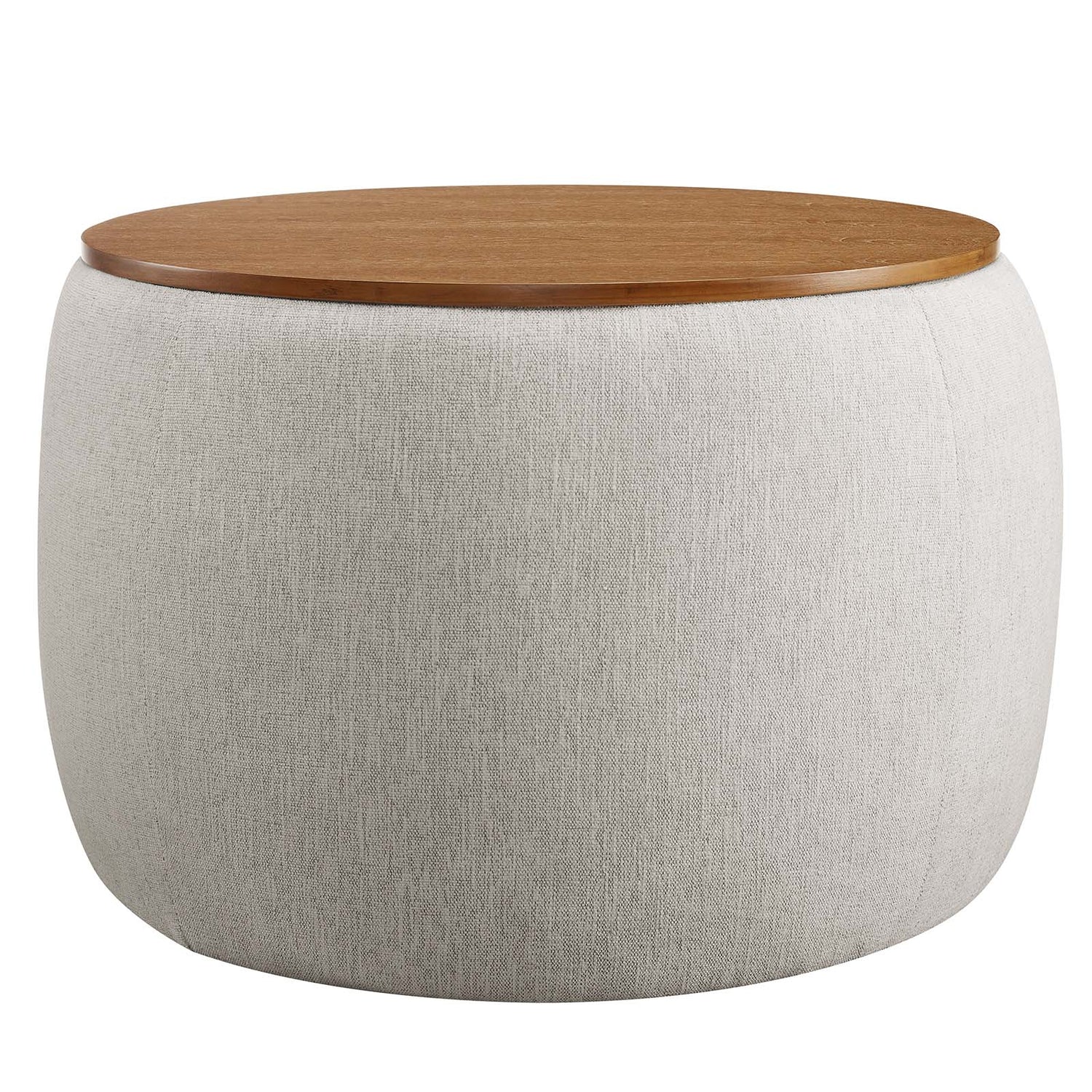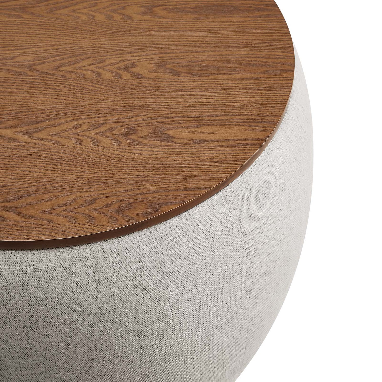 Refine your decor with the Perla Fabric Upholstered Storage Ottoman. Its sturdy plywood frame is wrapped in cushioning foam and upholstered in woven heathered fabric, while a sleek wood grain veneer lid adds clean functionality and aesthetic appeal. The Perla storage ottoman stands out with its polished silhouette, serving both as a chic round coffee table and a storage table. Its hidden concealed compartment is a discreet haven for your essentials, easily accessible beneath its tray-like lid. Whether you're stashing away linens or keeping your reading materials at hand, the Perla woven ottoman makes organization look good. Designed with modern living in mind, this round storage ottoman stool with lid features non-marking foot glides to protect your flooring, allowing you to rearrange without a second thought. Ready to use right out of the box, this storage stool awaits its role in your home's narrative, adding a touch of sophistication and practicality to your everyday. Weight Capacity: 264 lbs