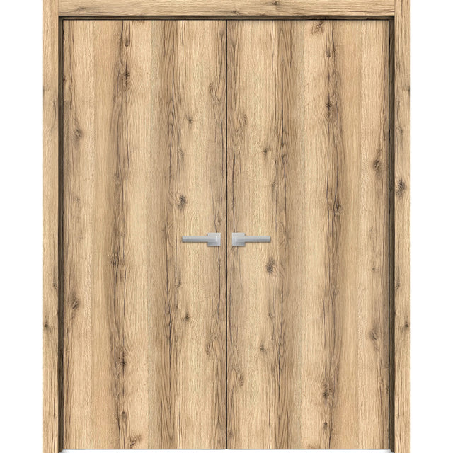 Planum Solid French Double Doors | Planum 0010 Oak | Wood Solid Panel Frame Trims | Closet Bedroom Sturdy Doors