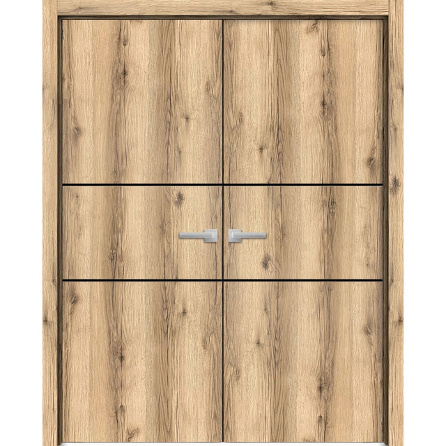 Planum Solid French Double Doors | Planum 0014 Oak | Wood Solid Panel Frame Trims | Closet Bedroom Sturdy Doors