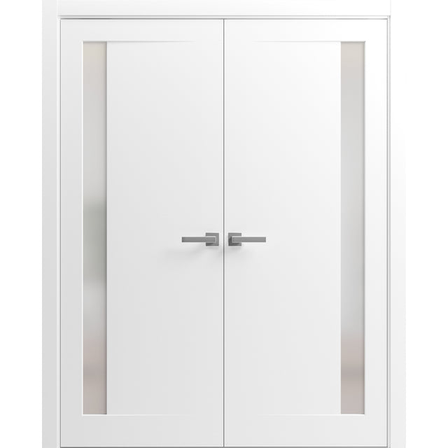 Planum Solid French Double Doors | Planum 0660 Painted White with Frosted Glass | Wood Solid Panel Frame Trims | Closet Bedroom Sturdy Doors